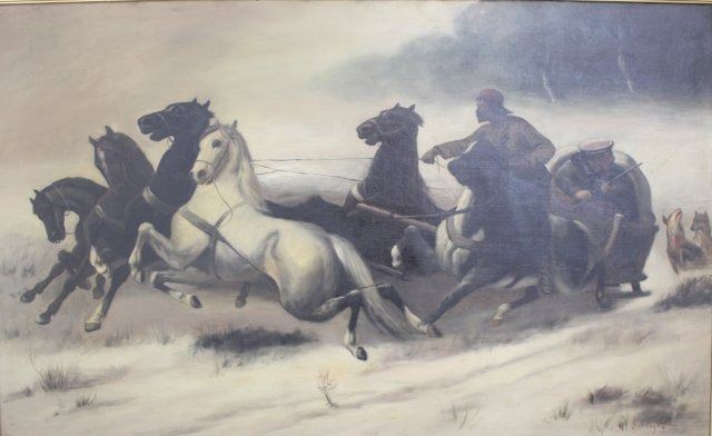 Oil on canvas. Signed lower right. Approx. 22" H x 36" W unframed, 32" H x 46" W framed. From a Long Island, NY estate.