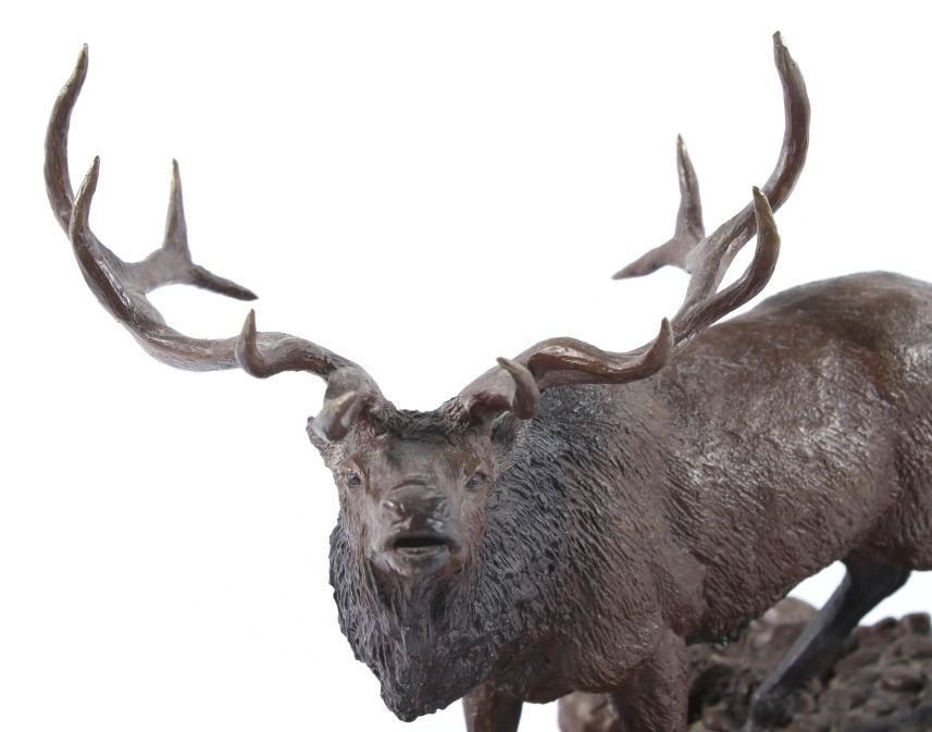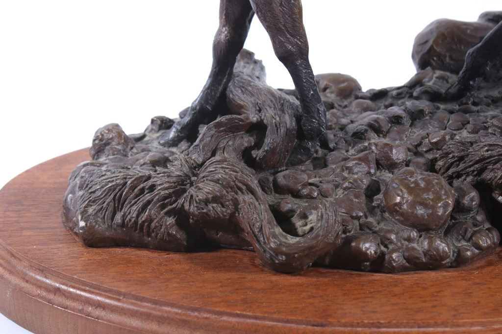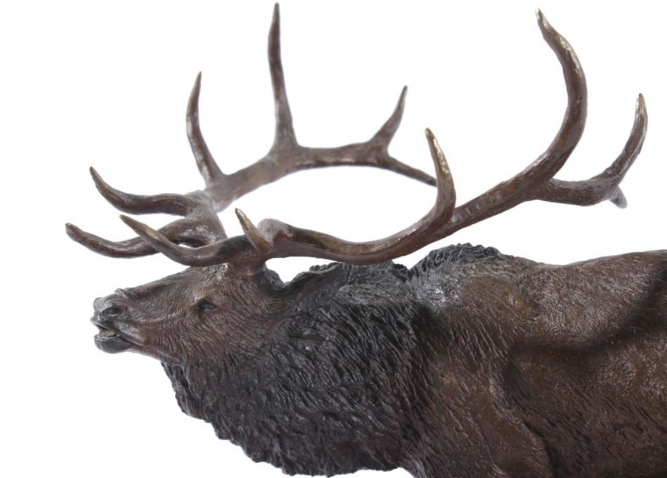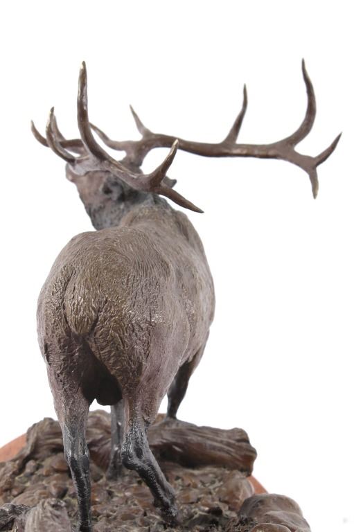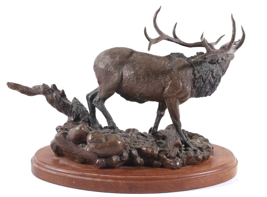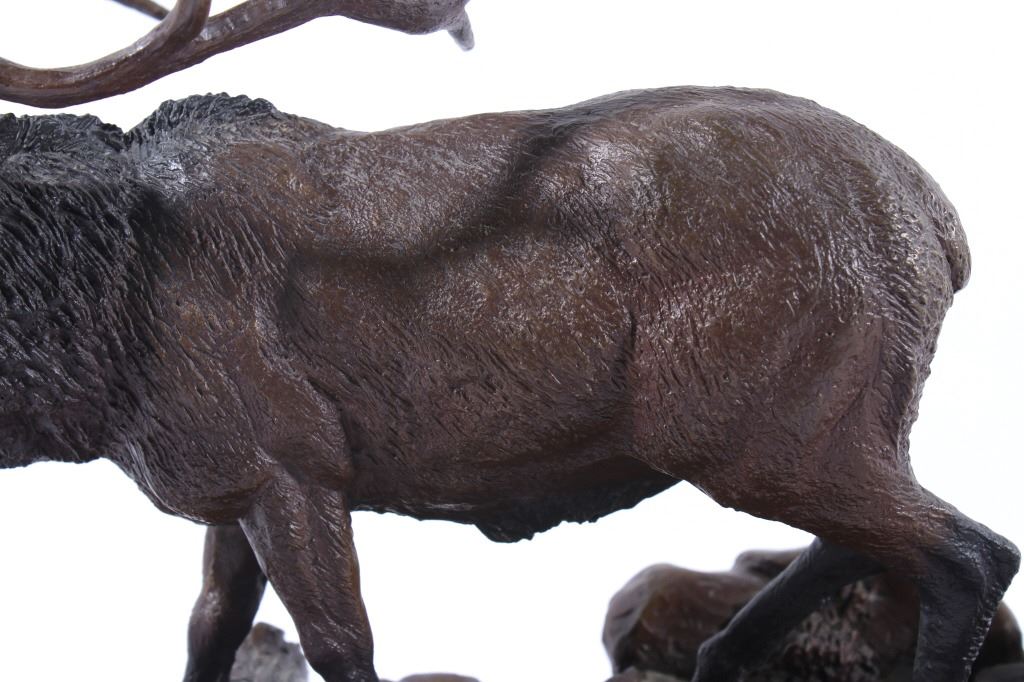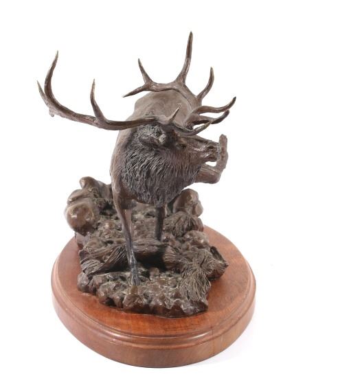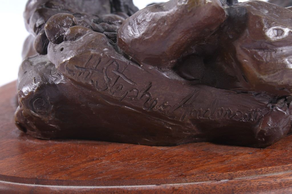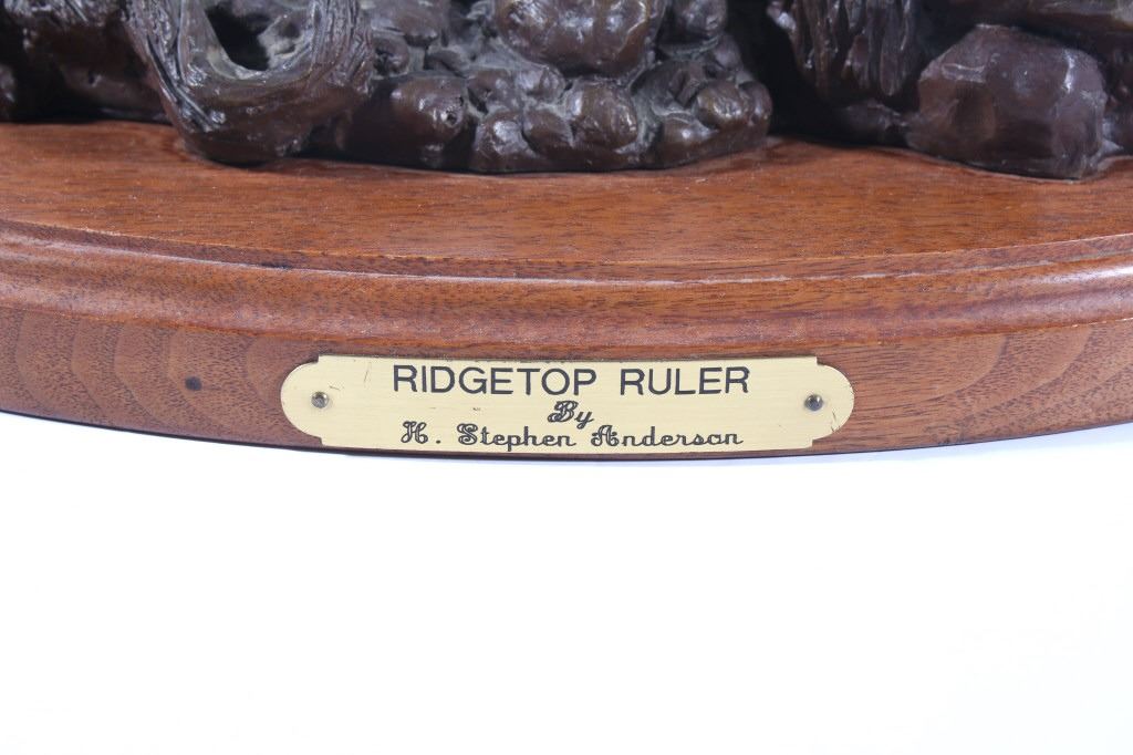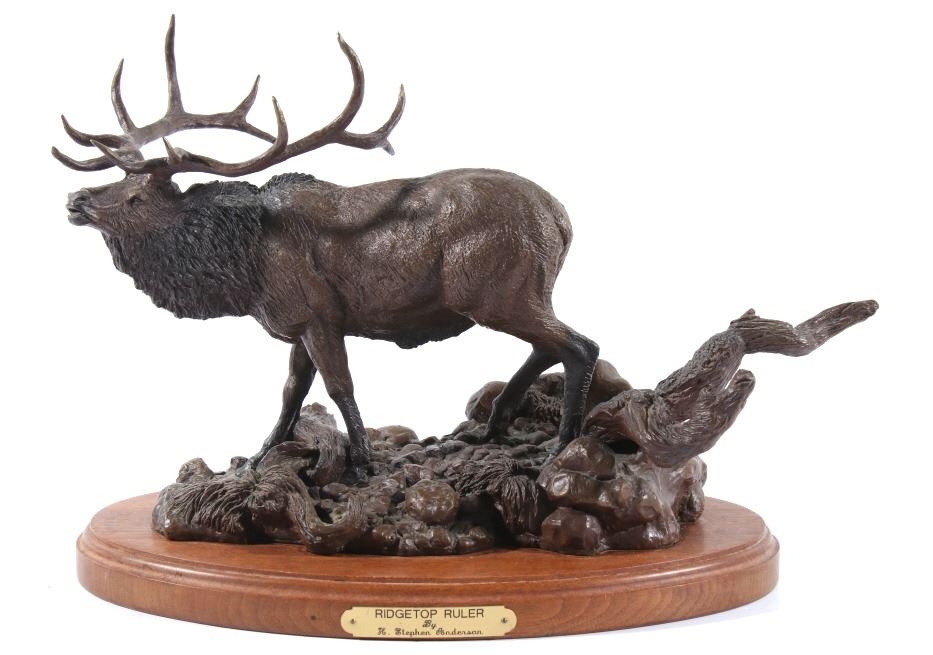 Available in this lot we have a signed Ridge Top Ruler bronze statue by H. Stephen Anderson and originating from 1985. The statue features a large bull elk as it is bugling and walking on a stony landscape. The bull elk shows an impressive set of 6x6 antlers and displays excellent attention to detail. The elk is shown walking on a stone covered path with a couple fallen logs or dead trees. The bronze is signed across the back "H. Stephen Anderson c 85 100". The statue is set onto a hard wood base with a brass plaque across the front reading "Ridge Top Ruler by H. Stephen Anderson". The piece shows good condition with little to no wear. It measures 11 3/4" tall overall with the base measuring 15" long by 9" wide.