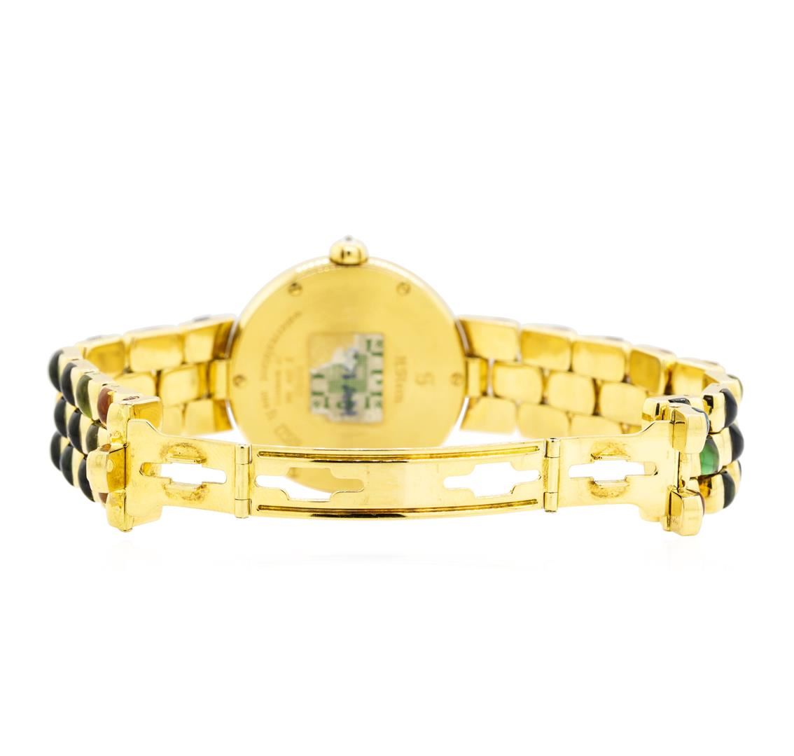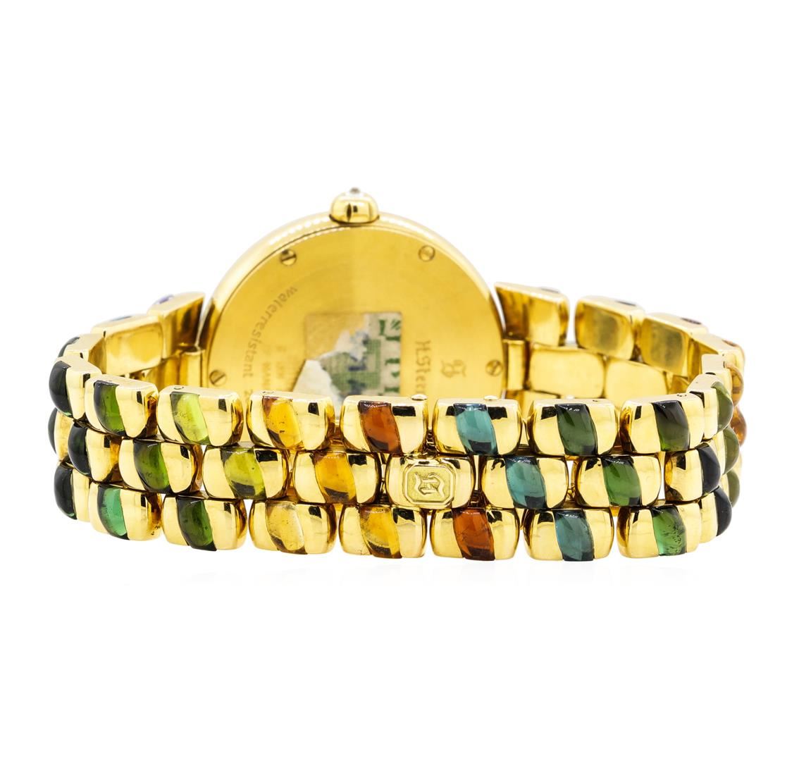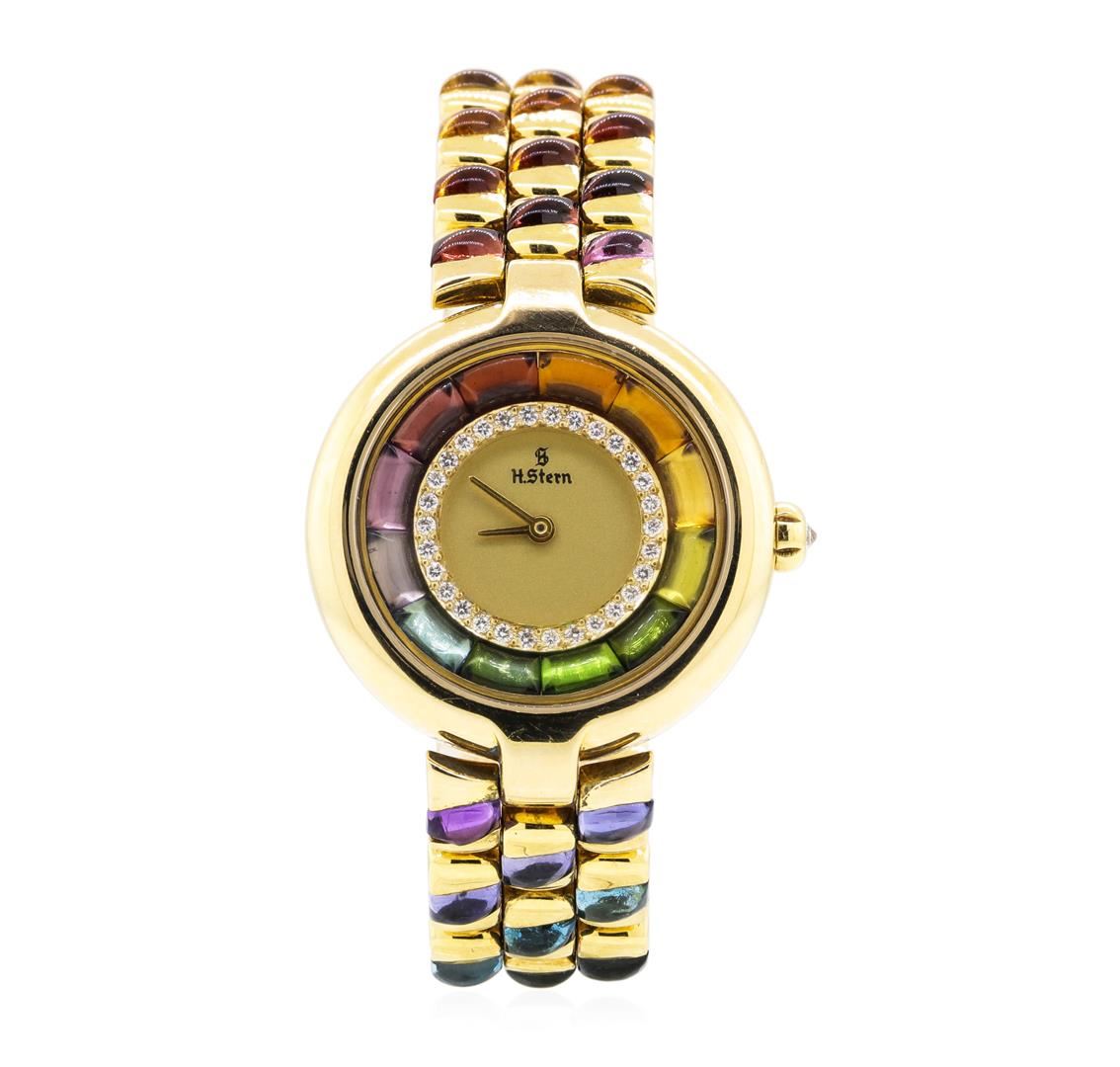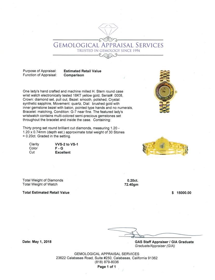 One lady's, hand crafted and machine milled H. Stern round case wrist watch electronically tested 18KT yellow gold, Serial#: 0008, Crown: diamond set, pull out, Bezel: smooth, polished, Crystal: synthetic sapphire, Movement: quartz, Dial: brushed gold with inner gemstone bezel with baton, pointed type hands and no numerals, Bracelet: matching, Condition: G-7 near fine. The featured lady's wristwatch contains multi-colored semi-precious gemstones set throughout the bracelet and inside the case. Containing: Thirty prong set round brilliant cut diamonds, measuring 1.20 - 1.20 x 0.74mm (depth est.) approximate total weight of 30 Stones = 0.20ct. Graded in the setting. Color F - G Clarity VVS-2 to VS-1 Cut Excellent. Total Weight of Diamonds 0.20ct.. Total Weight of Watch 72.40gm GAS Appraised at $15000.00. GAS Appraised at $15,000.00.