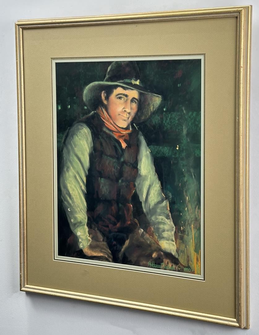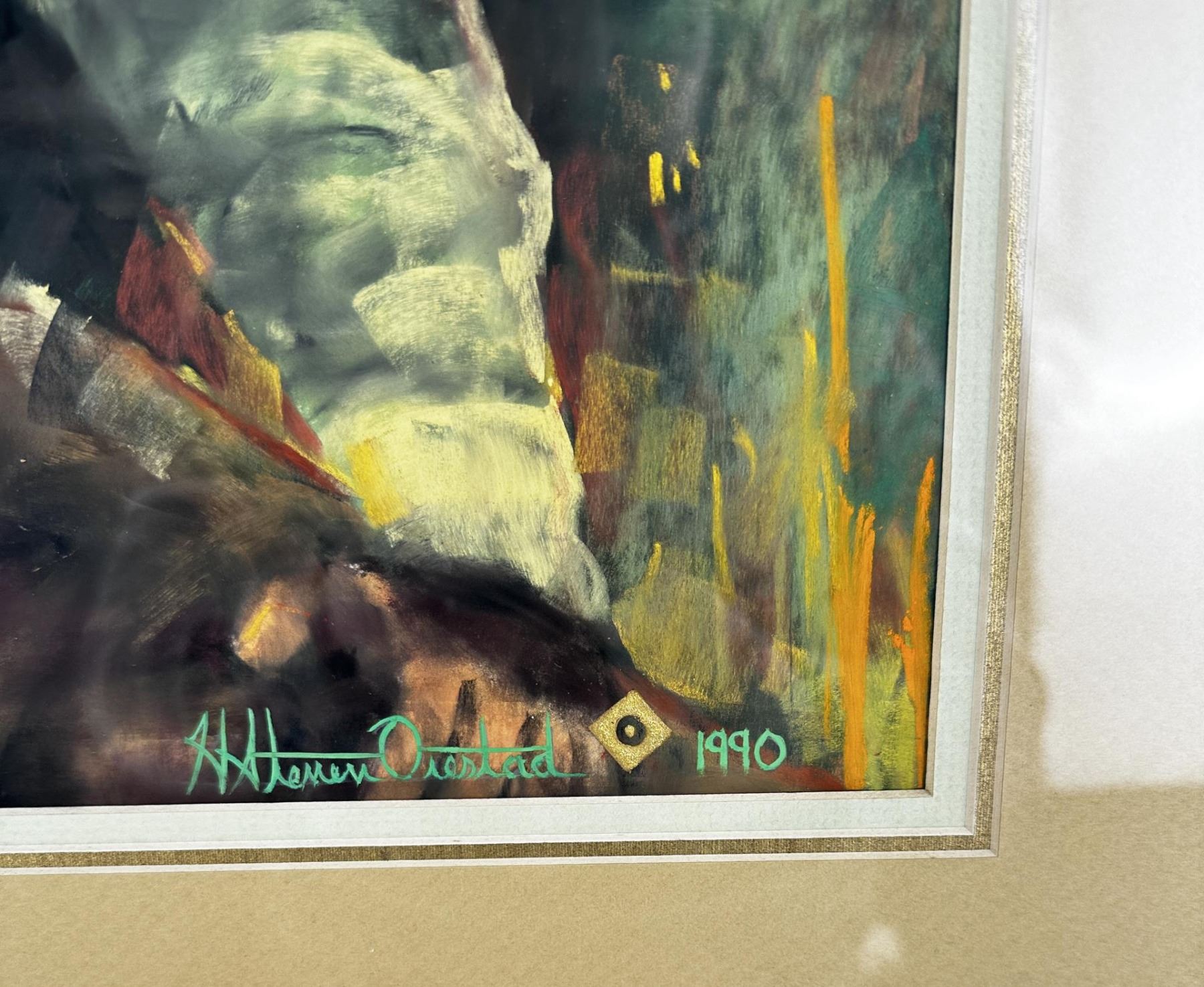 24 1/2" by 28" framed. H. Steven Oiestad (Born 1956) was active/lived in Montana. H Oiestad is known for Rural landscape, animal, still life. H. Steven Oiestad was born and raised on a ranch near Big Timber, Montana, and spent his childhood years studying and sketching the animals in his environment. He moved to Great Falls in the late 1980s, where his passion for art was once again renewed, thanks to an incredible group of artists who reside in the area. Working from his home and studio in the beautiful Sun River Valley, not far from Great Falls, Oiestad mainly concentrates on the cowboy and landscapes of present-day America. Steven Oiestad won the second place prize in the animal and wildlife category of the Third Annual Pastel 100.