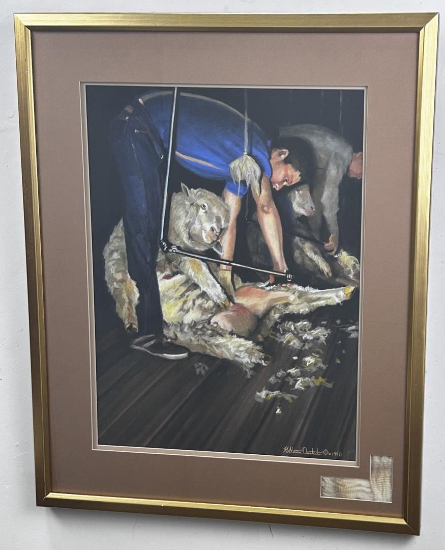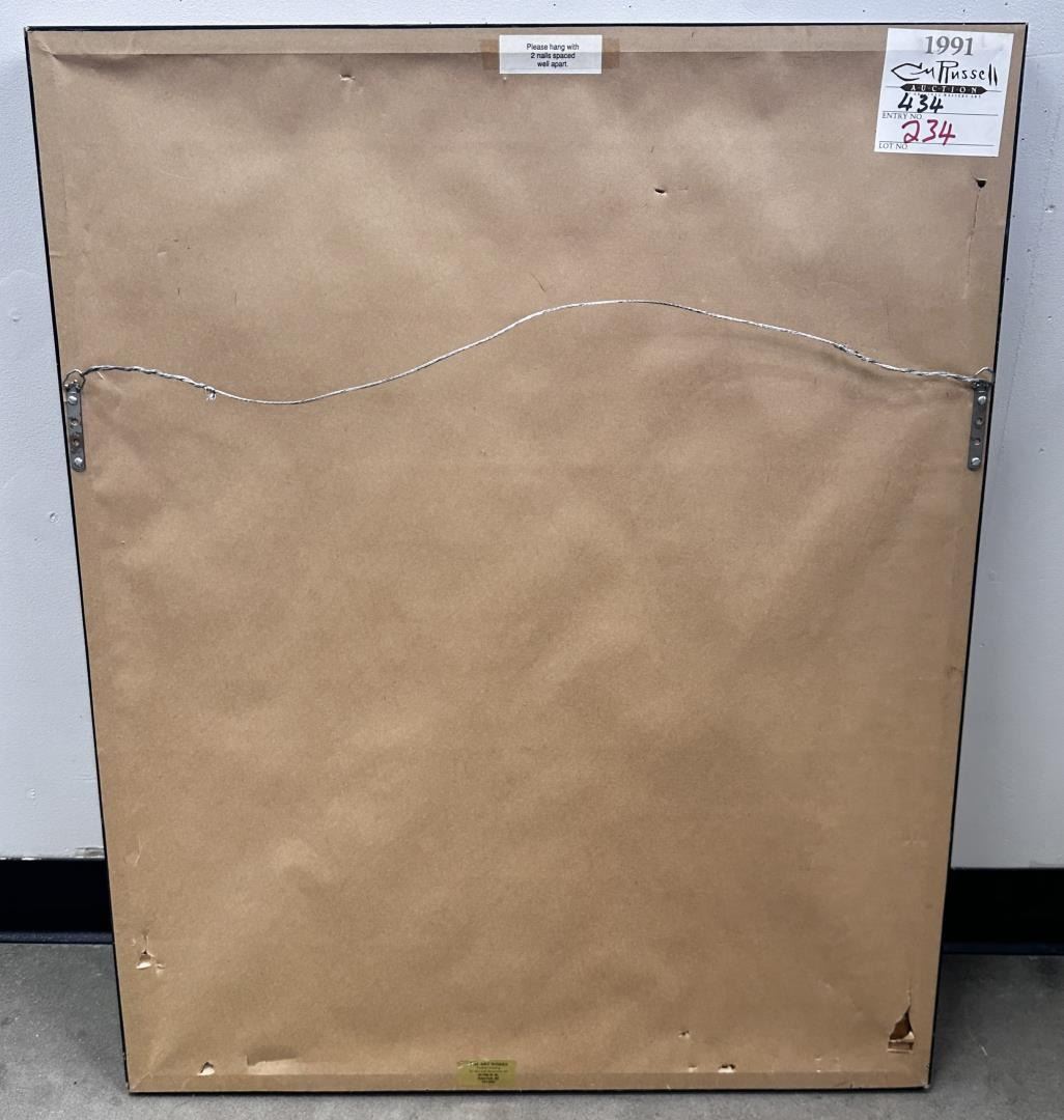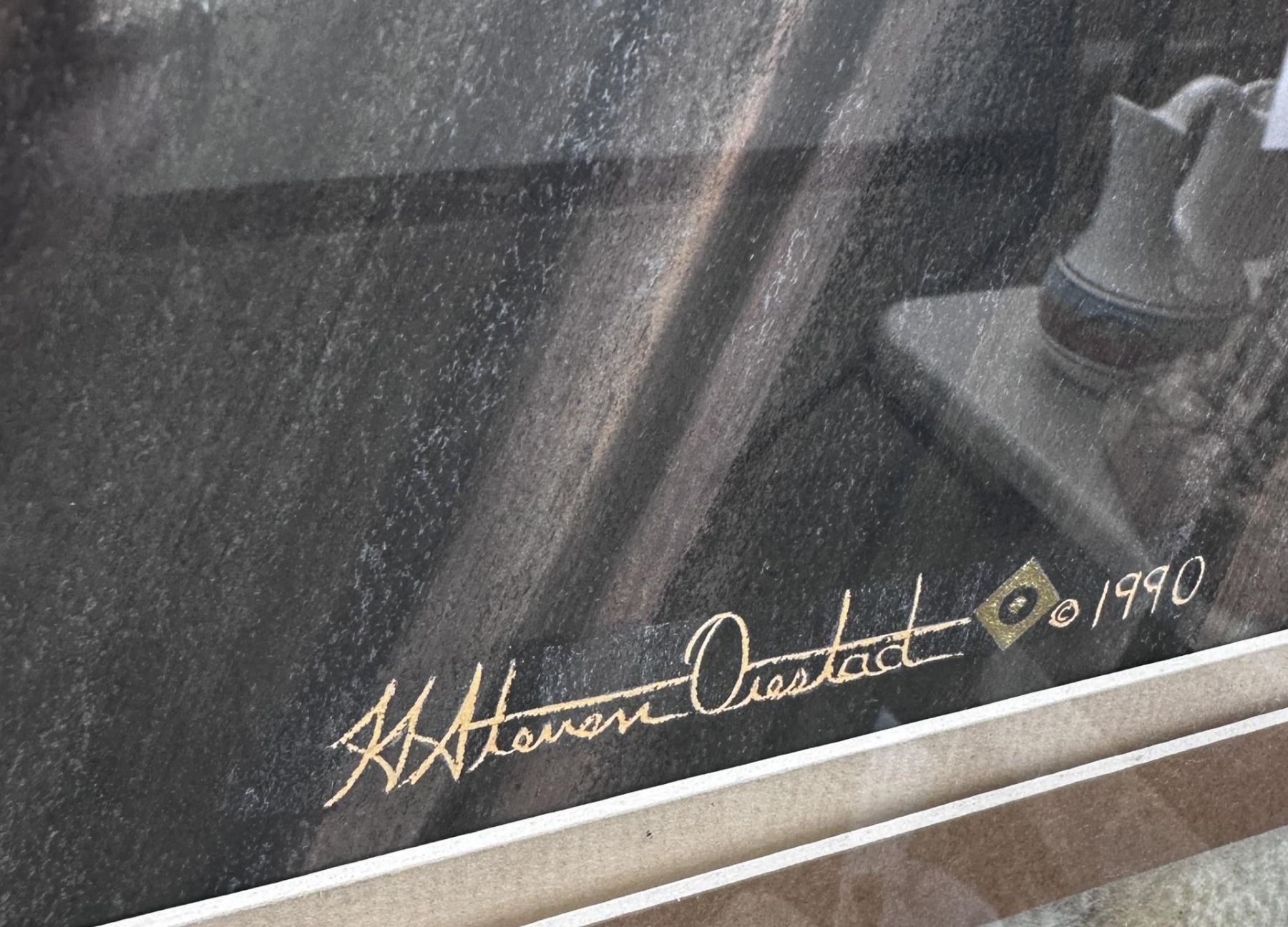 28" by 34 1/2" framed. H. Steven Oiestad (Born 1956) was active/lived in Montana. H Oiestad is known for Rural landscape, animal, still life. H. Steven Oiestad was born and raised on a ranch near Big Timber, Montana, and spent his childhood years studying and sketching the animals in his environment. He moved to Great Falls in the late 1980s, where his passion for art was once again renewed, thanks to an incredible group of artists who reside in the area. Working from his home and studio in the beautiful Sun River Valley, not far from Great Falls, Oiestad mainly concentrates on the cowboy and landscapes of present-day America. Steven Oiestad won the second place prize in the animal and wildlife category of the Third Annual Pastel 100.