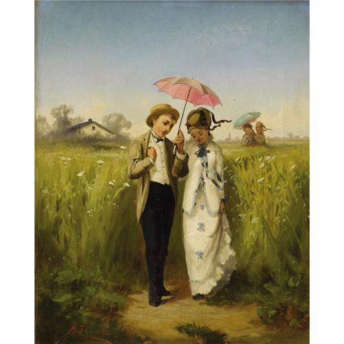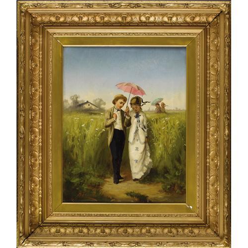 <B>HENRY T. CARISS</B></I> (American 1840-1903)<BR><I>Untitled (Couple in a Field)</B></I> <BR>Oil on canvas<BR>19-1/2 x 15-1/2 inches (49.5 x 39.4 cm)<BR>Signed lower left:<I> H.T. Cariss</B></I><BR><BR>Provenance:<BR>Private Collection (Dallas, Texas) <B>Condition Report:</B> Evidence of restoration, slight abrasion and paint loss in lower center and right edge<BR><BR><b>Shipping:</b> Requires 3rd Party Shipping (<a target="_blank" href="http://www.heritageauctions.com/common/shipping.php">view shipping information</a>)