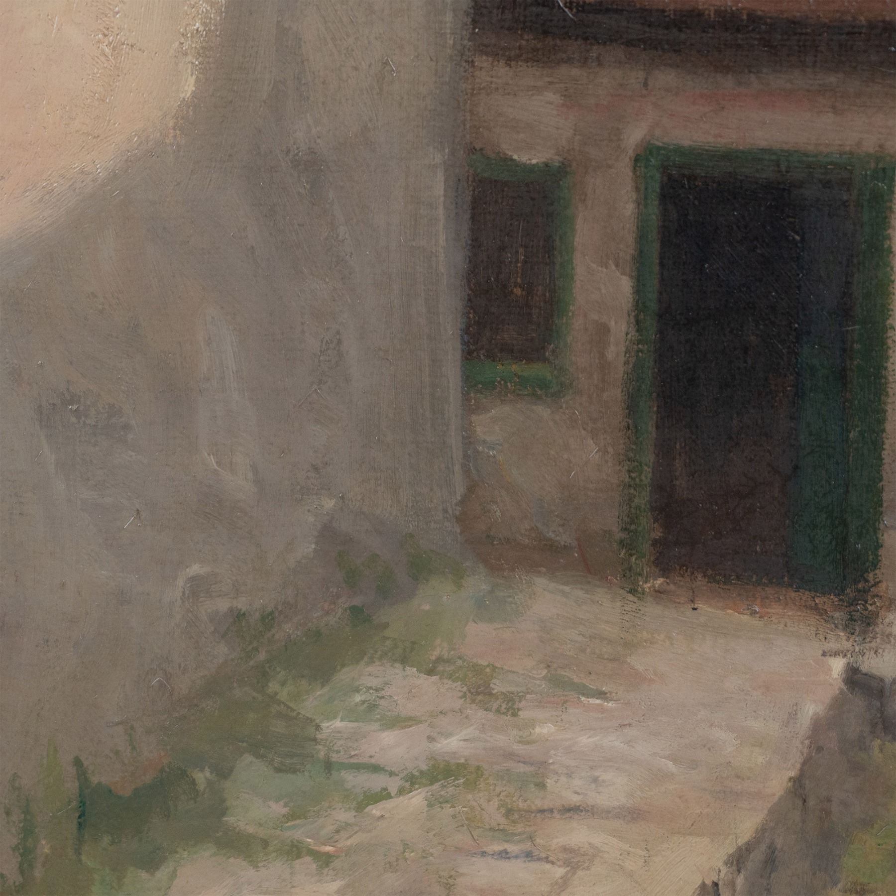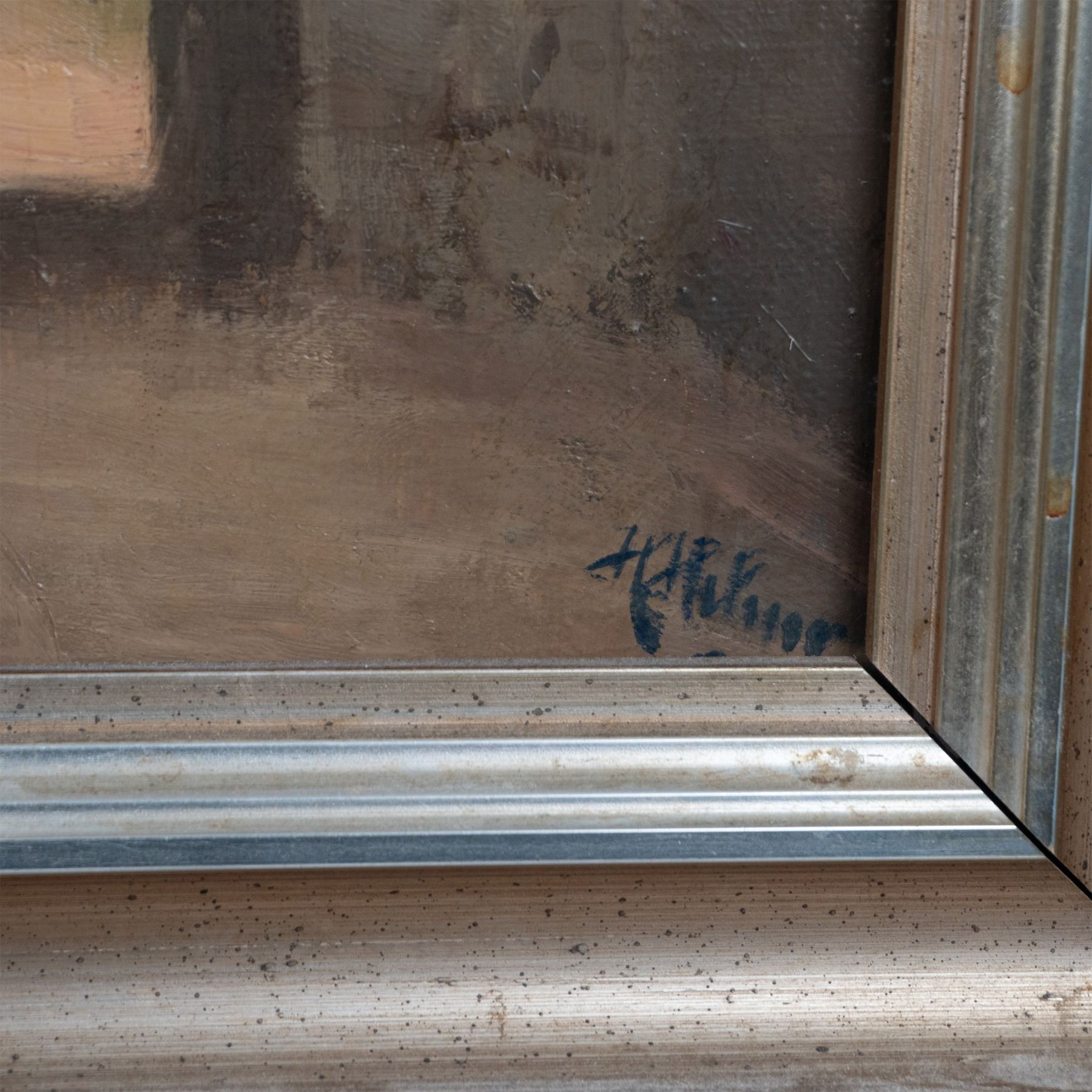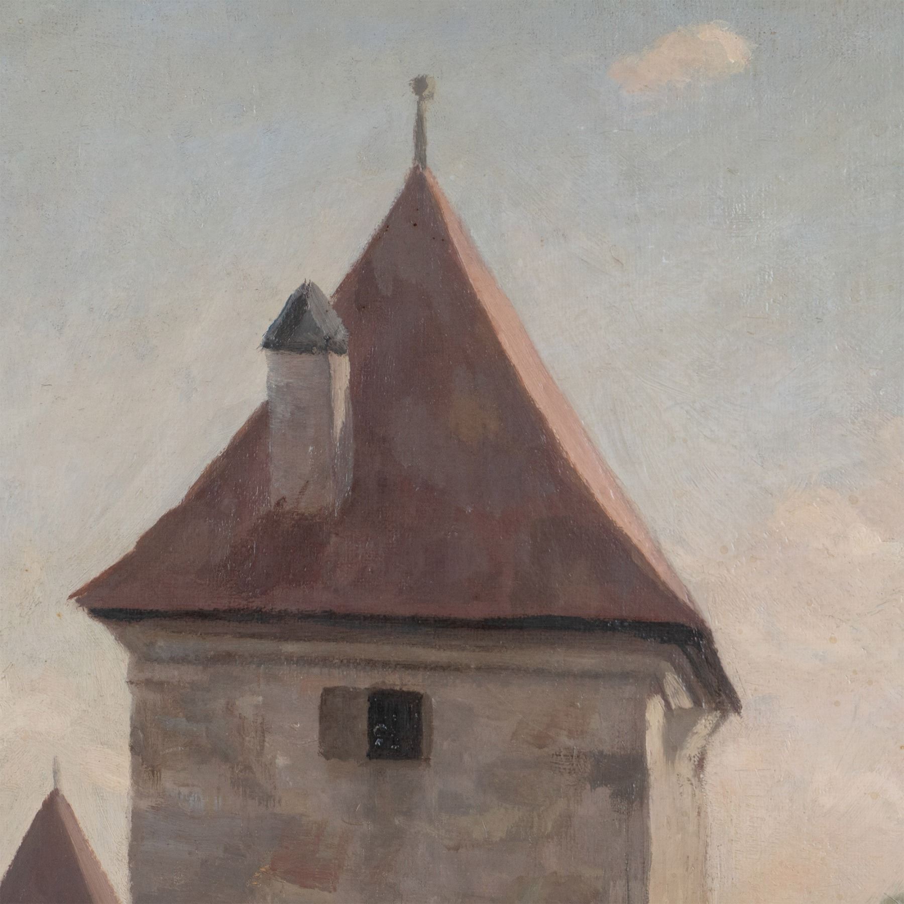 Exceptional original oil painting on canvas by renowned Danish artist H. Thoring (also known as Kai Jeppe Drews). Titled Outside of Town Gate of Rothenburg, this piece beautifully captures one of the iconic gates of the historic medieval city of Rothenburg, Germany. Signature and date on lower right: H. Thoring 38. Artwork dimensions: 21"L x 26.50"H. Frame dimensions: 25"L x 30.75"H x 2"W.