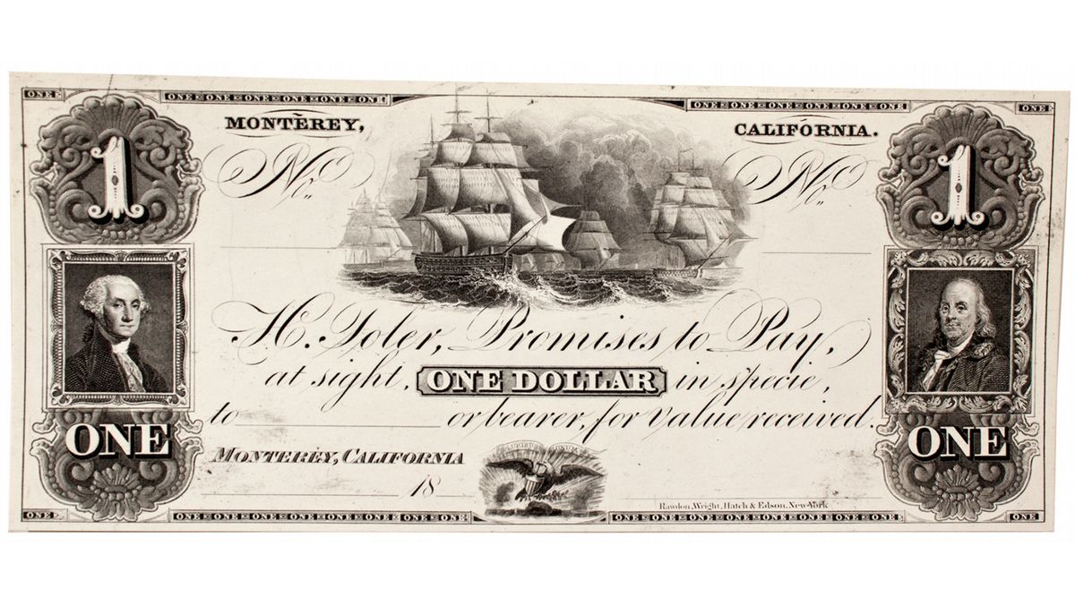 c1890 This unusual piece measures 7.5” x 3.25”and was printed on thick paper. The right side has some small smudge marks, but otherwise excellent condition. It was printed by Rawdon, Wright, Hatch & Edson. N.Y. There is no print date. The obverse vignettes are of Geo. Washington and Ben Franklin, along with a central clipper ships scens, and an Eagle with shield at the bottom. On the back a purple stamp reads “Property of American Bank Note Co. SPECIMEN." - HKA#64960