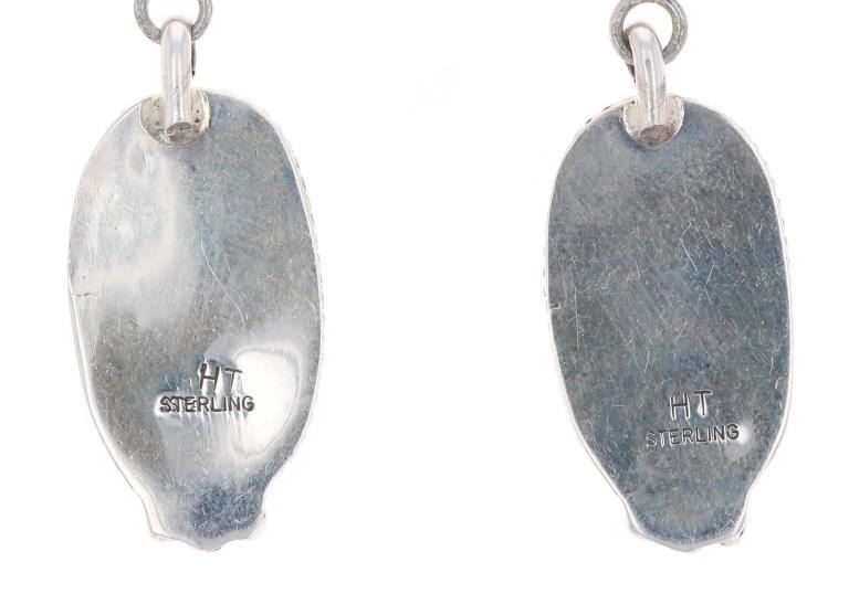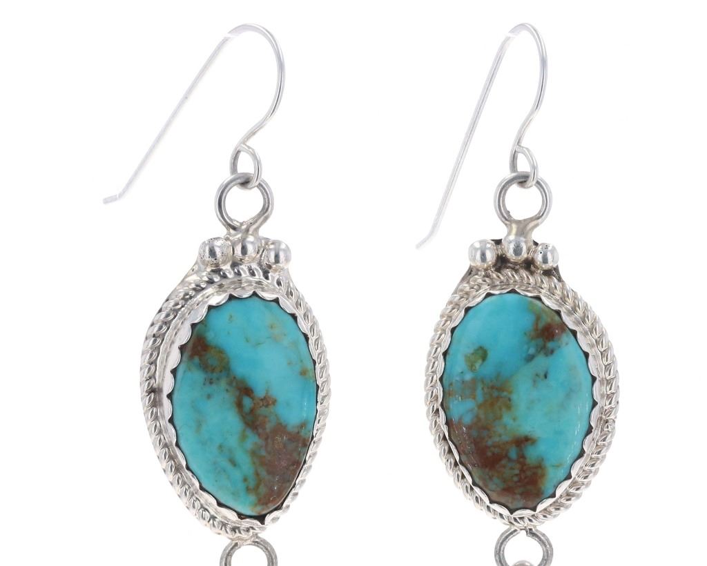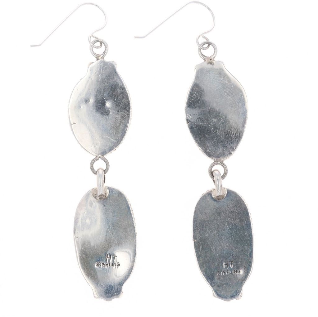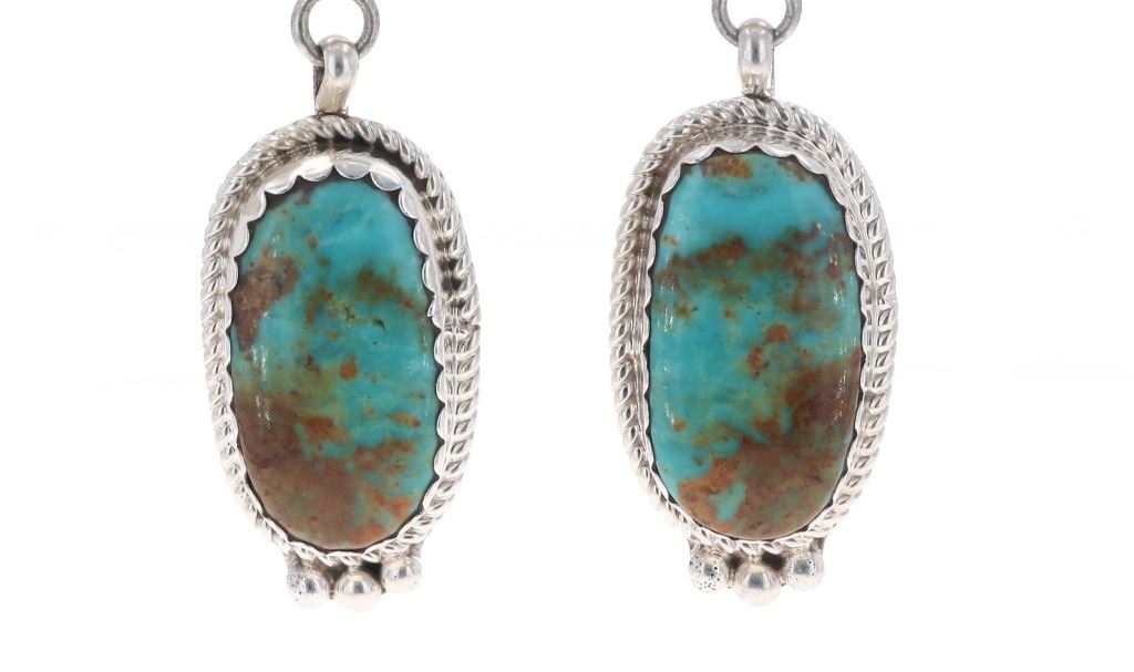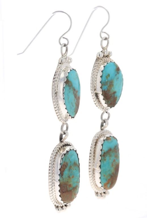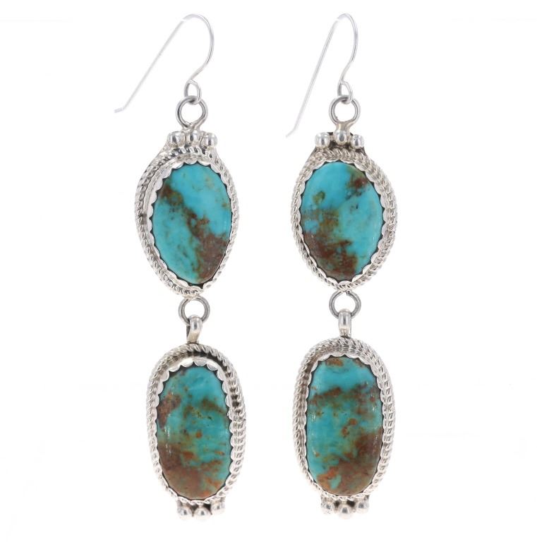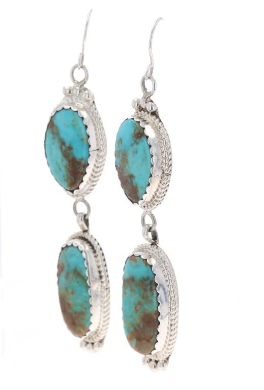 The lot features a set of sterling silver earrings by Navajo / Dine artist Herbert Tsosie set with Royston Turquoise. These dangle earrings show four polished cabochons of Roystone mine turquoise with a polished rope silver setting with silver spots. These are in like new condition. Each measures 3.25"L each. Total weight of 24.5 grams.