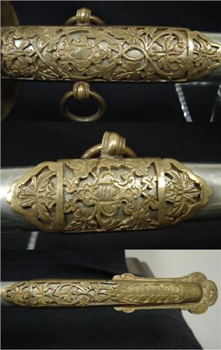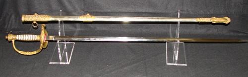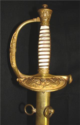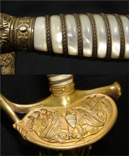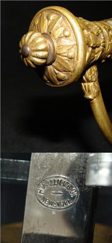 H.V. ALLIEN & CO. MODEL 1860 STAFF & FIELD OFFICER’S SWORD & SCABBARD. Has mother-of-pearl grip with gilded brass hilt. Kidney-shaped counter-guard is decorated with eagle and flags. There is a hinged guard on the reverse side that is operated with a button and spring. A lion face decorates the end of the quillon. Pommel is decorated with eagle and shield. Marked on ricasso “H.V. ALLIEN & CO./NEW YORK”. Scabbard is nickel plated with three brass rings and ornate mounts. Total length: 37 1/8”, Blade length: 30 ¾”