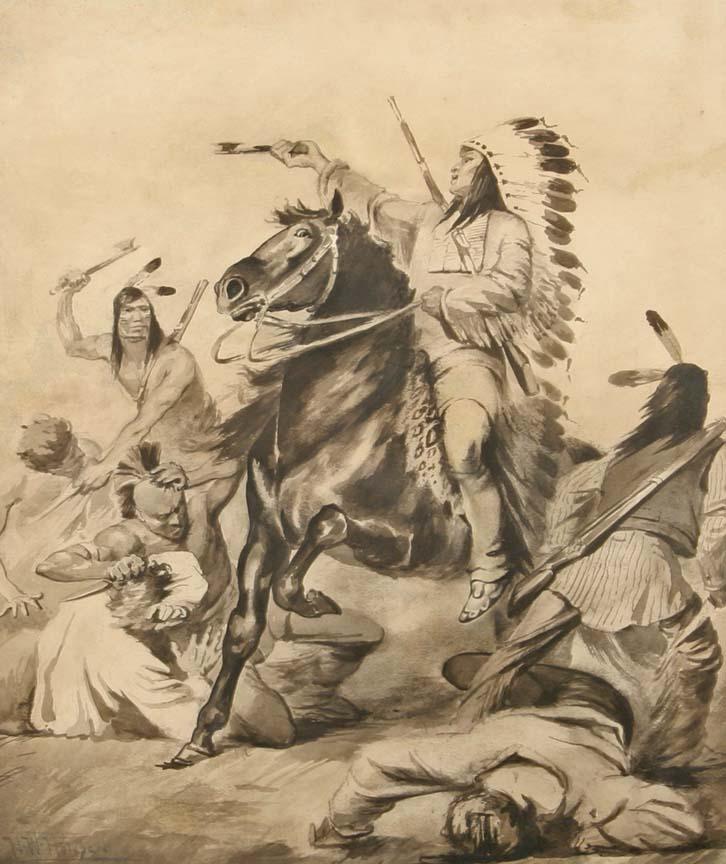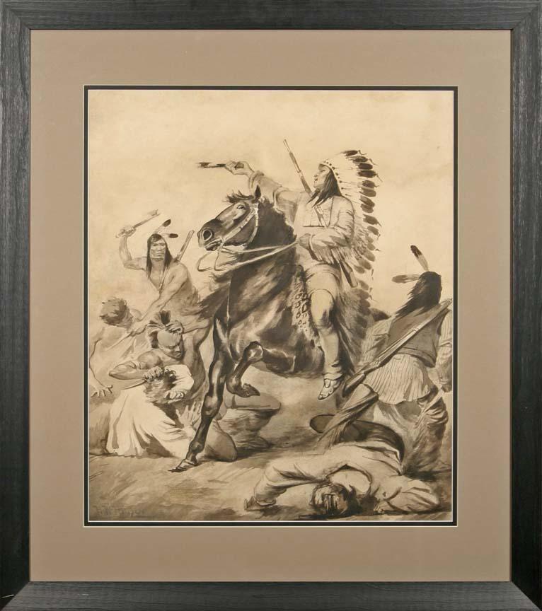 Herman Wendelborg Hansen (1854-1924) . Indian Attack. 21 ¾" x 18 ¼" ink wash. Signed lower left. (est $8,000-10,000). For condition reports please visit: www.auctioninsantafe.com/cr2011.pdf