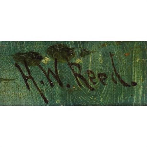 <B>H. W. REED</B></I><BR><I>Herding the Sheep</B></I><BR>Oil on canvas<BR>20 x 30 inches (50.8 x 76.2 cm)<BR>Signed lower right:<I> H.W. Reed</B></I><BR> <B>Condition Report:</B> Alligatoring throughout, border of yellow varnish around perimeter, scattered yellow varnish in composition, pinprick through canvas in upper right corner, surface grime.<BR><BR><b>Shipping:</b> Framed - without Glass, Medium (<a target="_blank" href="http://www.heritageauctions.com/common/shipping.php">view shipping information</a>)