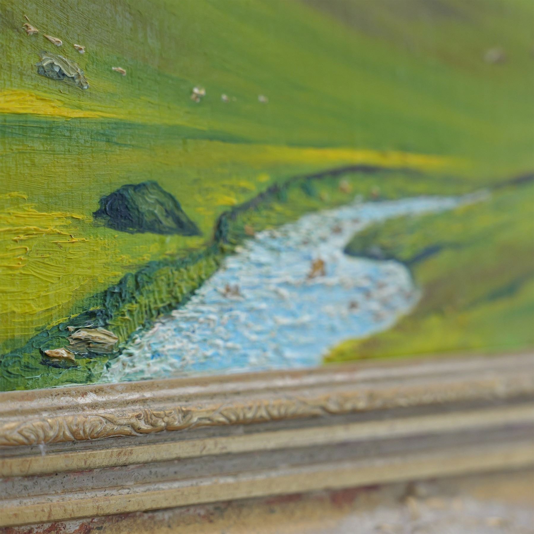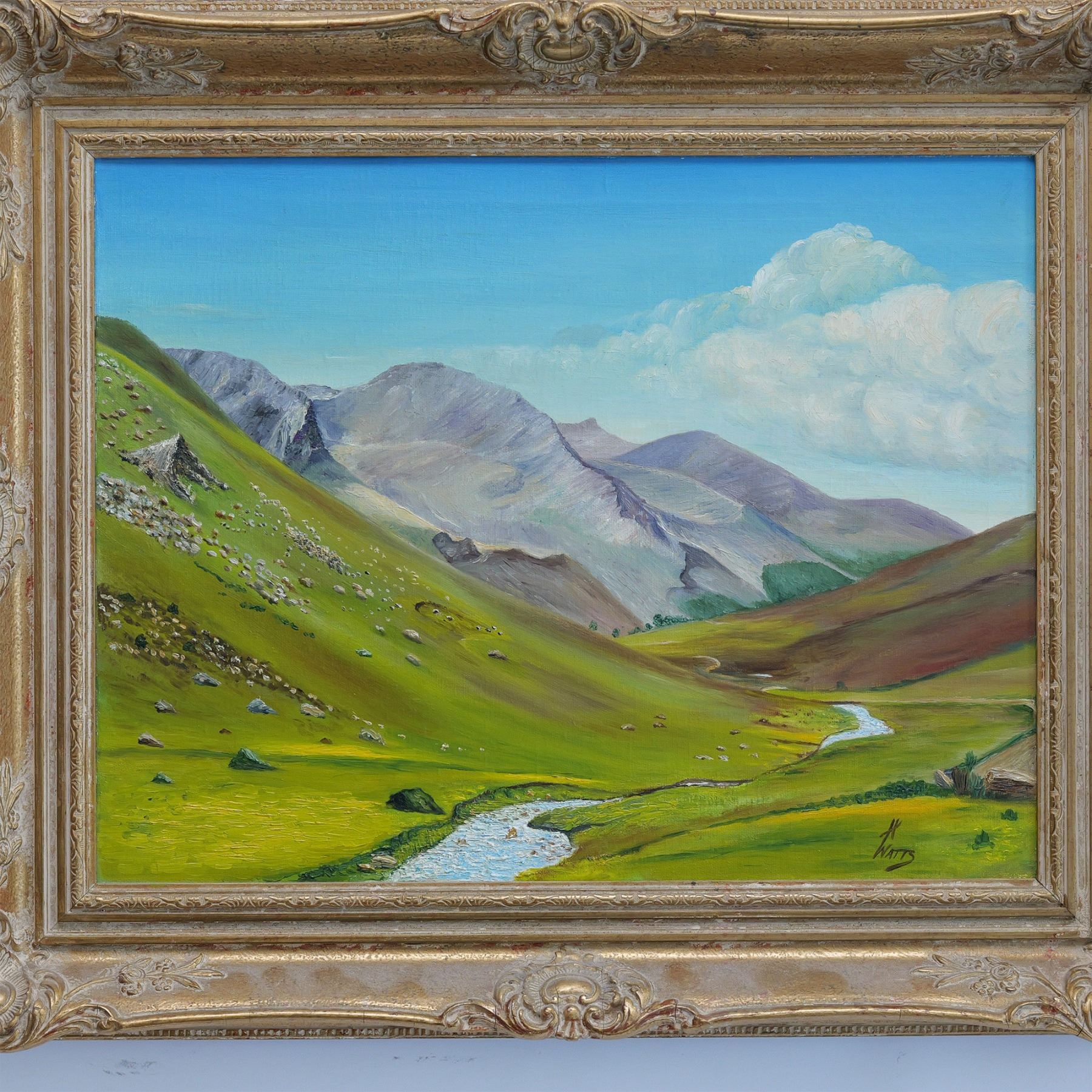 An original oil on canvas depicting a river winding through serene meadows in a picturesque mountainous landscape, likely in England or Scotland. Painted by Watts, the artwork features striking areas of impasto, adding texture and depth to the scene. Signature on lower right: H. Watts. Housed in an ornate gilded frame. Artwork dimensions: 17.50"L x 13.75"H. Frame dimensions: 23.75"L x 19.50"H x 2.50"W.
