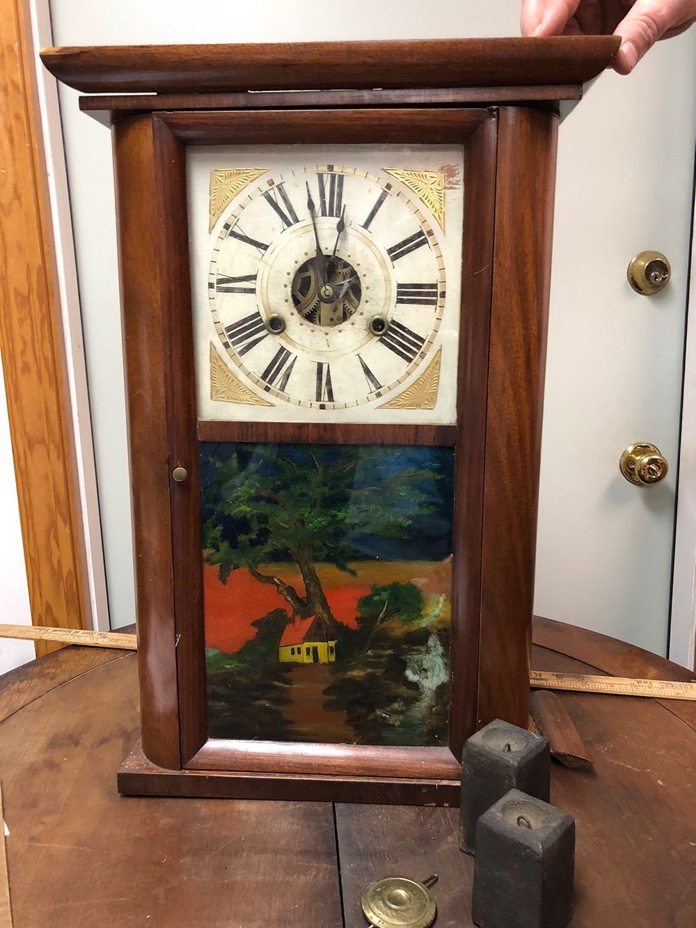 H. Welton, Terryville, CT with 30 hour weights, lower painted glass with house, tree and waterfall on pane.