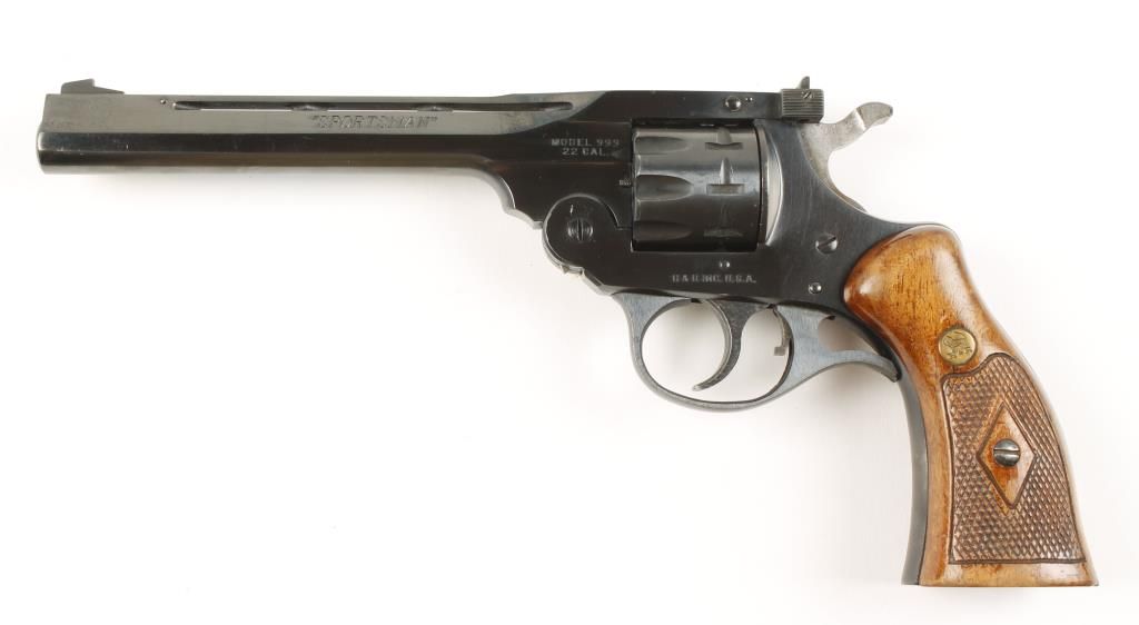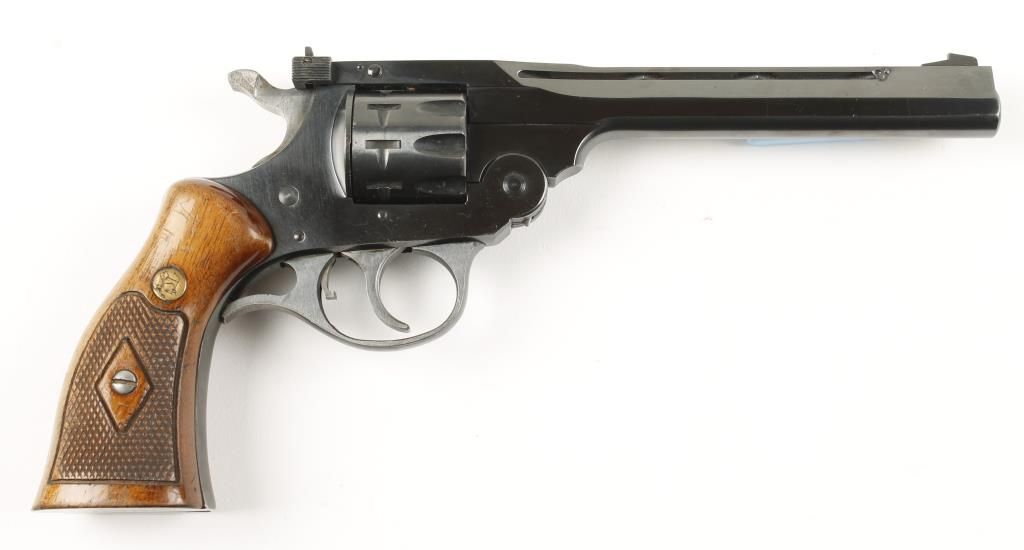 Double action top break 9 shot "Sportsman" revolver with 6" vent rib barrel. Blued finish, checkered diamond wood grips, and windage adjustable rear sight. Very good bore and action. Condition: Very Good overall showing light use and small area of pinpricking near muzzle. *MODERN FIREARMS*
