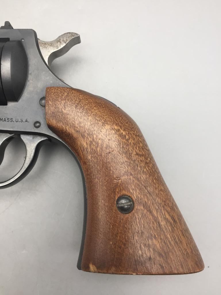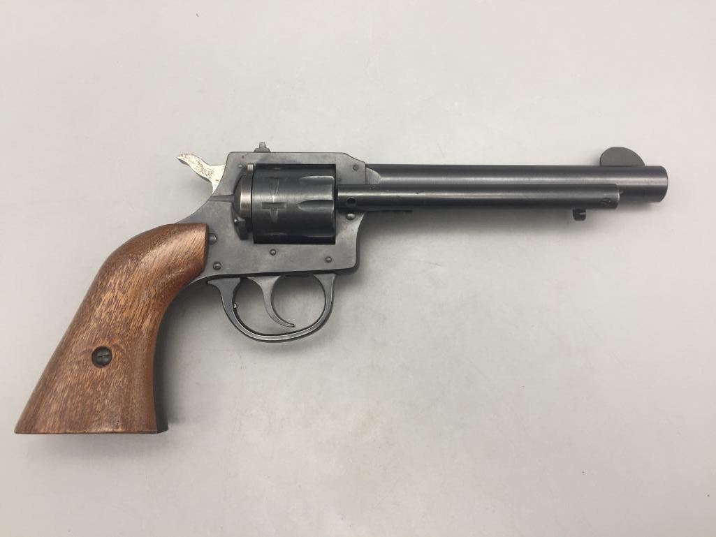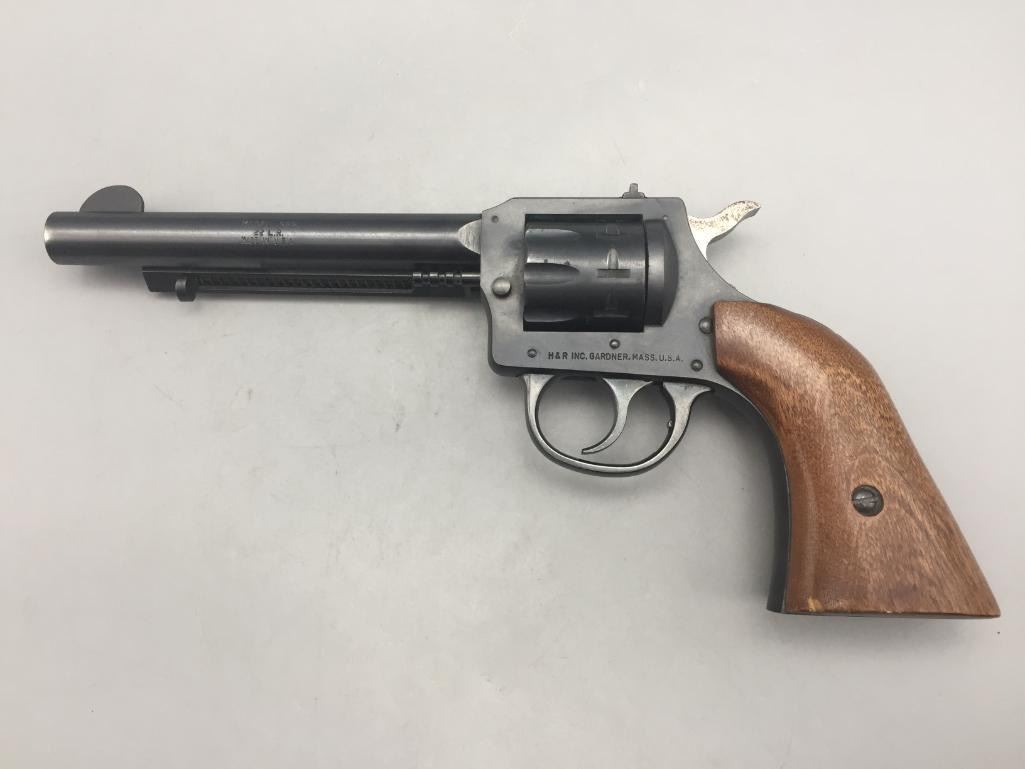 For your consider we offer this H and R Model 949, 9-shot revolver in a .22 caliber. It shows very light use. Maker: H and R, Inc. Serial No. AU063334. Approx. Age: Modern. Size: Barrel measures 5-1/2". Condition: Good, normal wear expected. Please look closely at the pictures - they are an important part of our description. Shipping: There will be a $15 handling, packaging fee for shipping this lot. The actual cost of postage will be added on top of that. *****This firearm requires an FFL Transfer*****