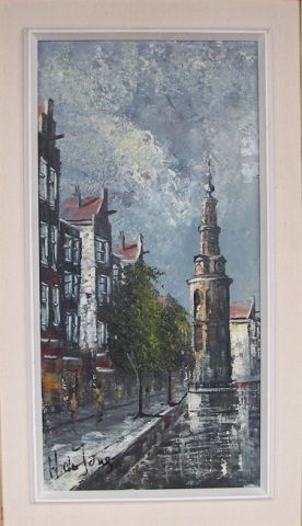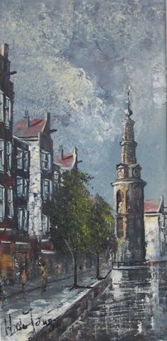H. de Jongl, OIl , (8224) H. De Jongl, Oil On Canvas, "wester Xoren Amsterdam", 23 1/2" X 12", Landscape, Signed Lower Left, Small 1 Inch Tear Right Side Middle