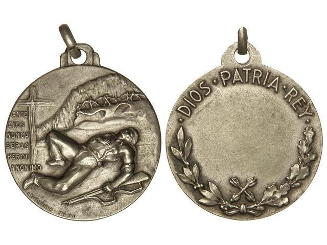 Héroes Anónimos. 1936-1939. CARLISMO. Anv.: Caído en campo de batalla junto a cruz. ANTE DIOS NUNCA SERÁS HÉROE ANÓNIMO. Rev.: DIOS PATRIA REX y aspa de Borgoña. Metal blanco. Ø 26 mm. PG-1057. EBC.