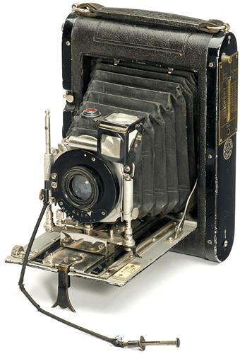 "Hekla", 1909 Hüttig A.G. Dresden. Zweiverschlußkamera, Schlitzverschluß (hängt). Mit Dagor Doppel-Anastigmat Serie III 6,8/135 mm. Verschlußzeiten bis 1/2.000 Sek.! Frontverschluß 1/25-1/100 Sek., Format 9 x 12 cm.
