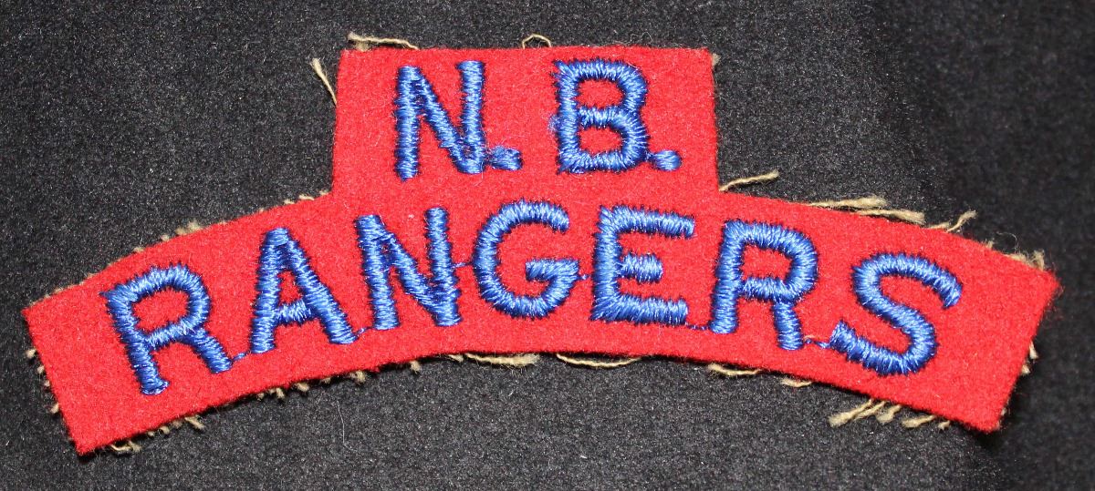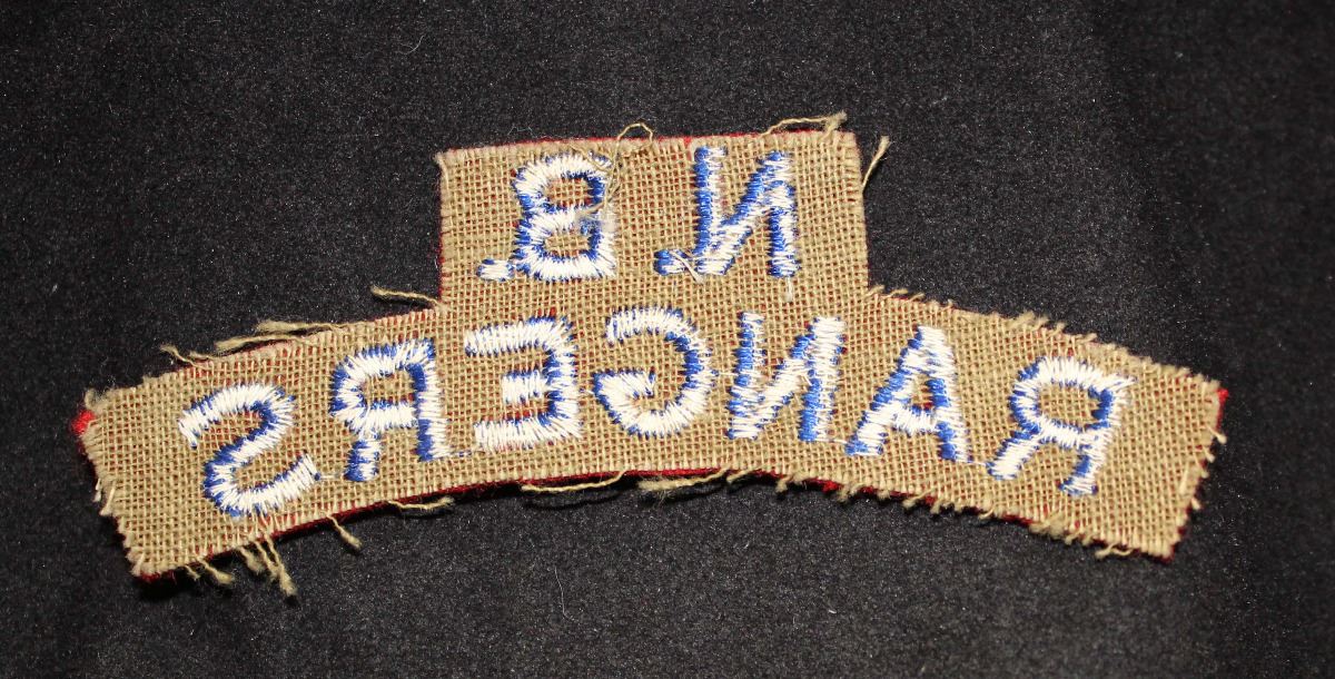 N.B. over RANGERS, curved up, blue on red with tan colored cloth backing.