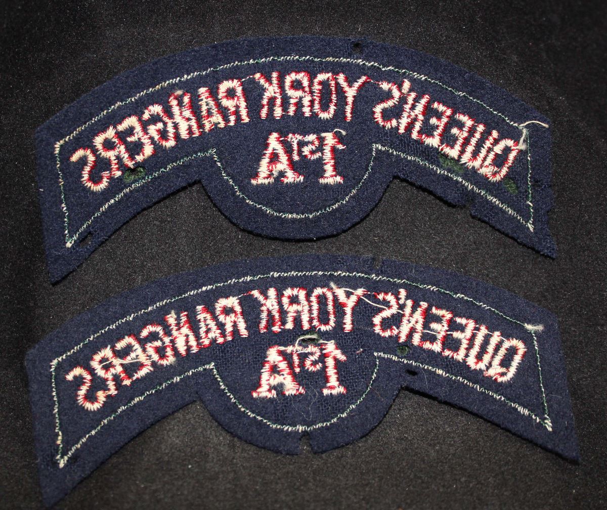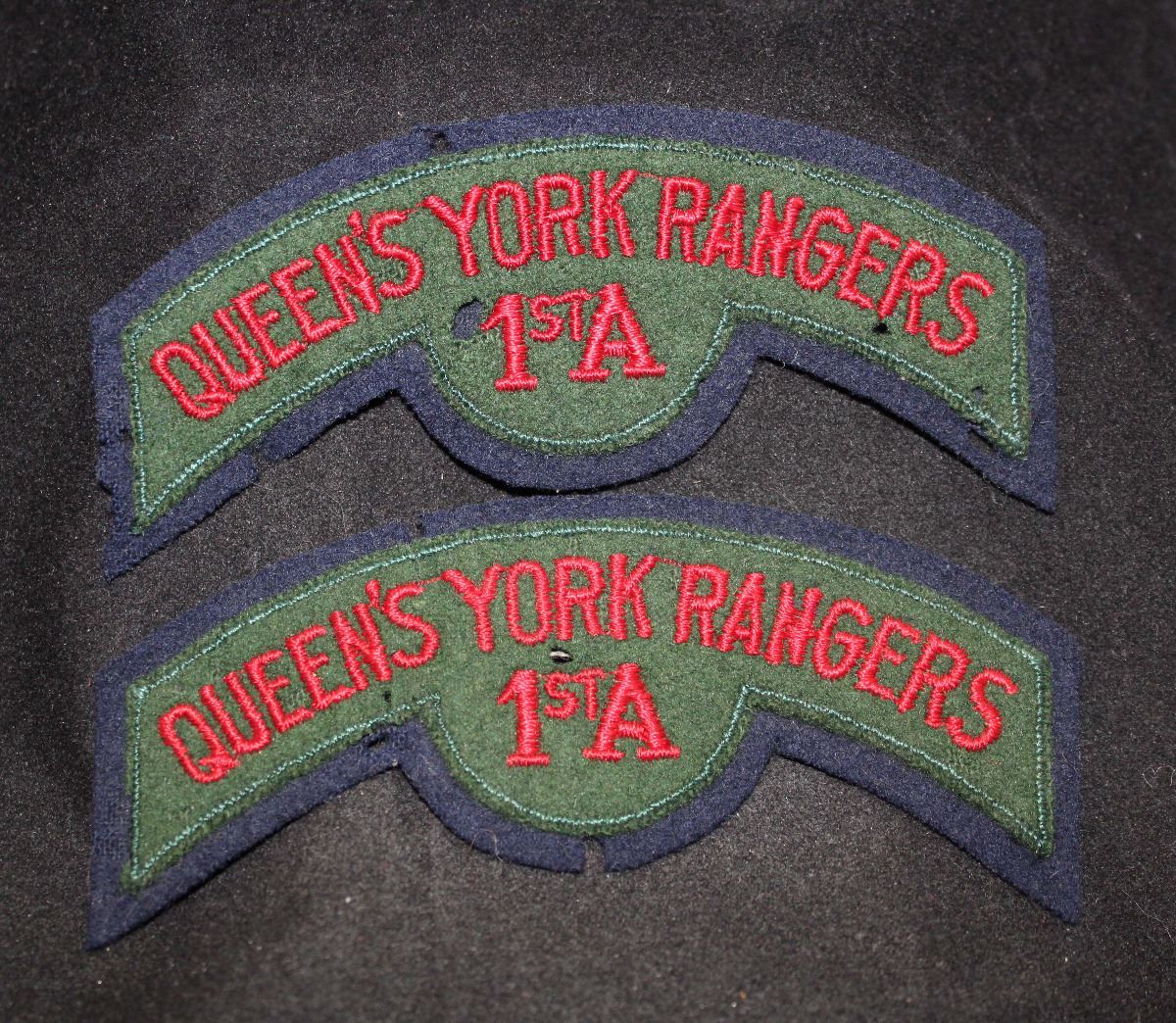 Both, QUEEN'S YORK RANGERS, curved up over 1ST A, dark red on green on blue, one has moth holes in the green and other has one moth hole in green and couple moth nips on the blue. Both black cloth backing. Lot of 2.