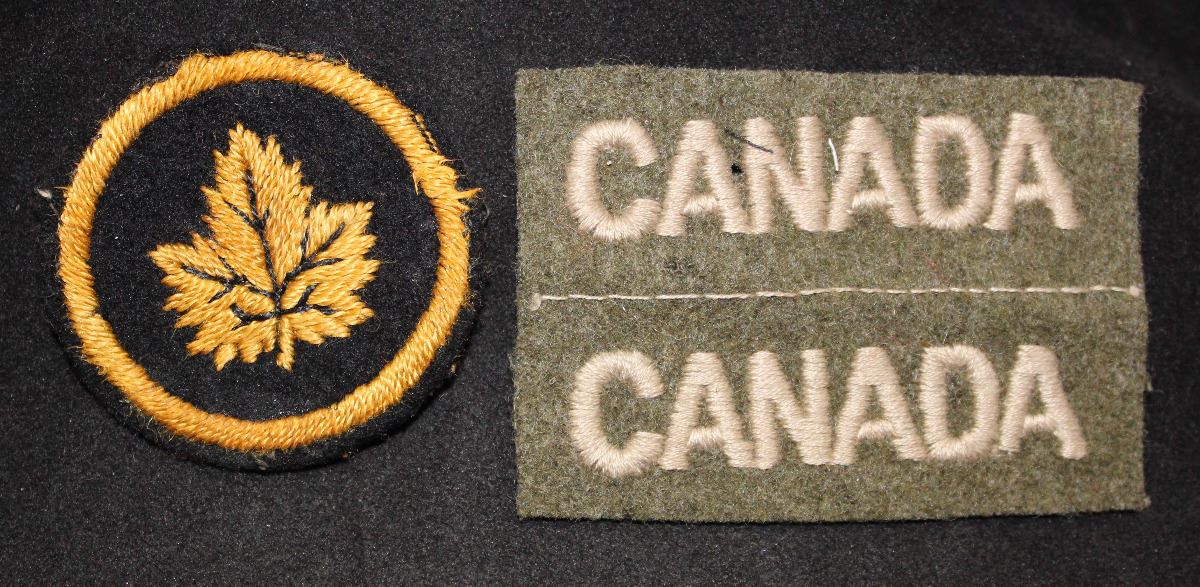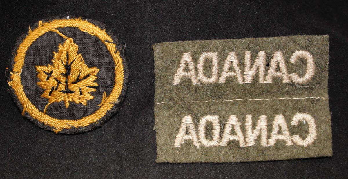 1 - Headquarters London flash dull gold yellow, with black thread veins in Maple Leaf and inner border, on black , with gray cloth backing, shows some age dulling. Pair, uncut, CANADA flashes, light tan white on khaki, there is a moth hole on the top one between the A and N. Lot of 2.