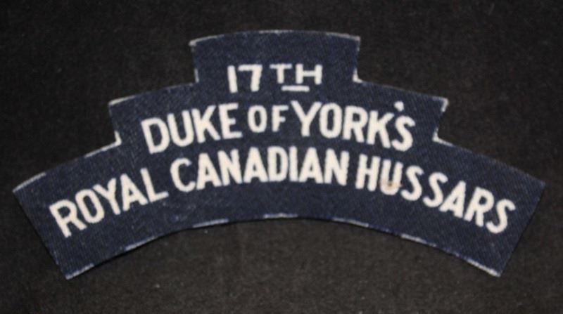 17TH/DUKE OF YORK'S/ROYAL CANADIAN HUSSARS, curved up, white on black with black backing. Excellent.