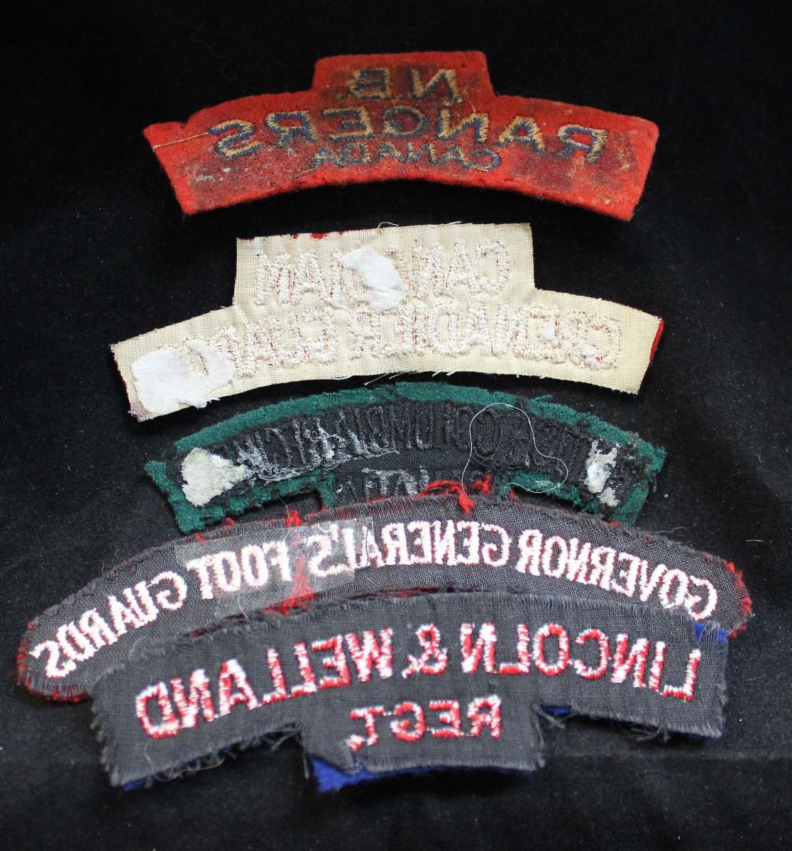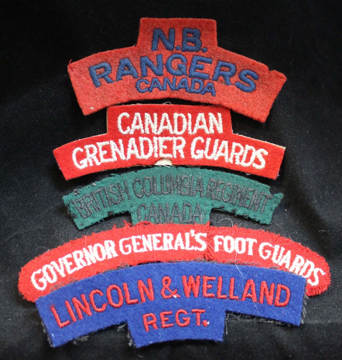 1 - GOVERNOR GENERAL'S FOOT GUARDS, white on red, black cloth backing, has been torn in half between General's and Foot. 1 - British Columbia Regiment, black on dark green, very dark, was sewn on at one time with threads remaining, black cloth backing. 1 - CANADIAN/GRENADIER GUARDS, curved up slightly, white on red, white cloth backing, paper and glue residue on back. 1 - N.B./RANGERS/CANADA, curved up, faded blue on faded red, glue residue on back, show age dulling and couple small moth nips on edge. 1 - LINCOLN & WELLAND/REGT. red on blue, black cloth backing, shows slight age dulling. Lot of 5.