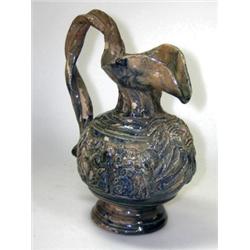 'H2 116', a blue mask jug with rope handle and beak spout, the bearded mask below between a frieze..