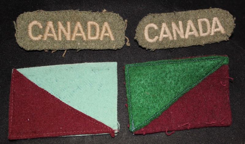 Lot of 4. 2 - 8th Canadian Div., Maroon over green, one - 1st pattern, dark green sewn onto maroon rectangle, was sewn on at one time, threads remain and one - 2nd pattern, maroon sewn on light blue green, shows some age dulling. 2 - WW2 CANADA flashes, light tan on khaki, show some age dulling.