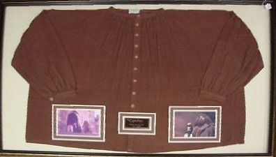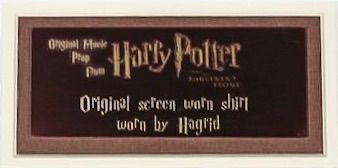 A CUSTOM FRAMED SHIRT WORN BY HAGRID (ROBBIE COLTRANE) IN HARRY POTTER AND THE SORCERERS STONE. THE SHIRT HAS THE WARDROBE LABEL ON THE INSIDE AND HAS BEEN MOUNTED IN A CUSTOM DISPLY ALONG WITH SOME PHOTOS FROM THE FILIM AND A CUSTOM PLAQUE. THIS IS A VERY LARGE DISPLAY MEASURING 64 x 44 x 2 INCHES AND MAY REQUIRE EXTRA SHIPPING COSTS. IF YOU DO NOT WANT TO PAY FOR EXTRA SHIPPING THE SHIRT CAN BE REMOVED FROM THE DISPLAY AND SENT WITHOUT THE DISPLAY.