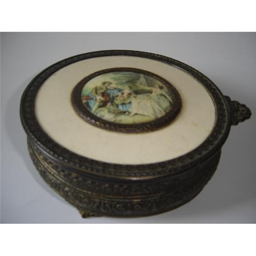 BEAUITFUL, RAT BOX. USED IN 1800,S FOR STORING HAIR AFTER BRUSHING IT. VERY, VERY, HEAVY.THE LID HAS VICTORIAN DESIGN.INSIDE THE THREE TRAY DIVIDE.WHICH GLASS.THREE INCHES HIGH AND 7 INCHES DIAMETER ON TOP.THEY ARE HARD TO FIND.