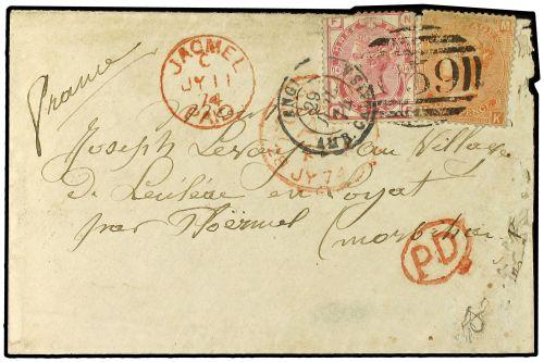 1874 Envelope to France bearing Great Britain 4 d orange (plate 13) (SG 95) and 3 d rose (plate 14) (SG 144) (faults) tied by C59 Jacmel with adjacent JACMEL PAID, handstruck oval P.D. routed via London with LONDON PAID cds and FRENCH arrival. Mixed quality but rare item.