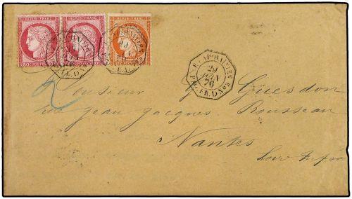 1876 LE CAP a FRANCIA. Circulada con sellos franceses de 40 cts. naranja y 80 cts. rosa (2). Mat. octogonal LE CAP HAITIEN/ PAQ. FR. D Nº 3. MAGNIFICA Y MUY RARA.