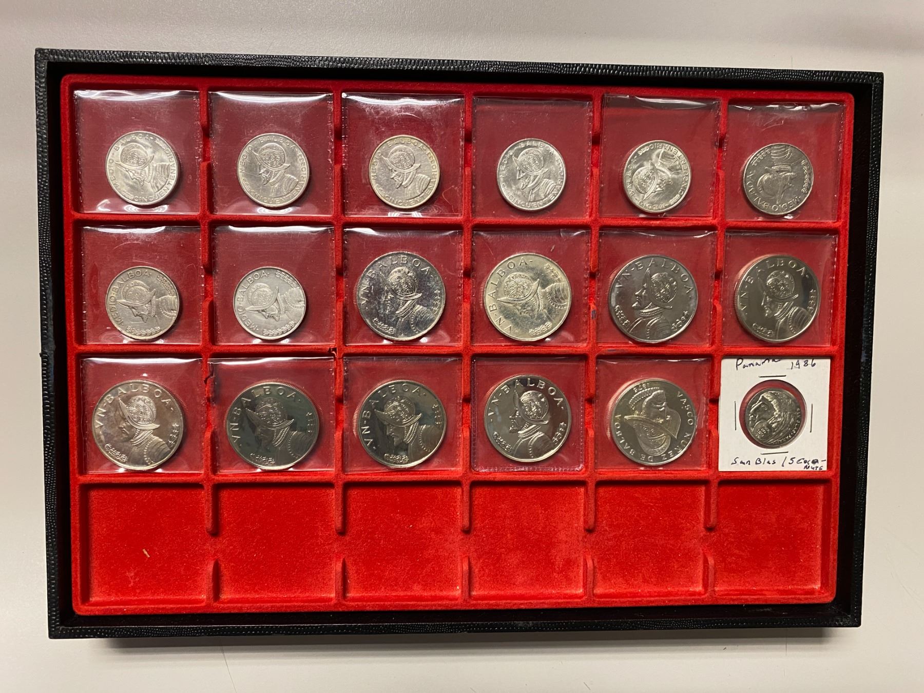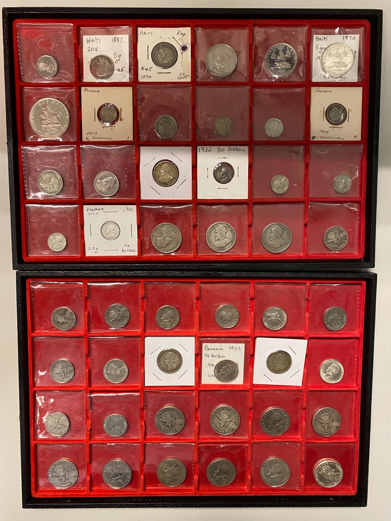 HAITI & PANAMA: LOT of 66 coins, including Haiti: 5 centimes (1 pc), 20 centimes (2), 5 gourdes (3), and 50 gourdes (1); Panama: 1/2 centesimo (1), 2½ centesimos (2), 5 centesimos (2), 10 centesimos (3), 1/10 balboa (5), 25 centesimos (3), 1/4 balboa (15), 1/2 balboa (18), and balboa (9); and Panama/San Blas Islands (1); average circulated grades, with many uncs and proofs, all but 5 are silver, in consignor's 2x2 holders, viewing recommended; retail value $1100, lot of 66 coins.