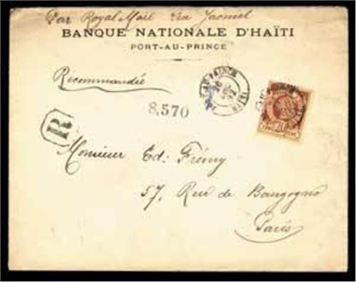 1892 reg cvr to Paris from Port-au-Prince franked with 20c Liberty tied by despatch cds with another strike alongside