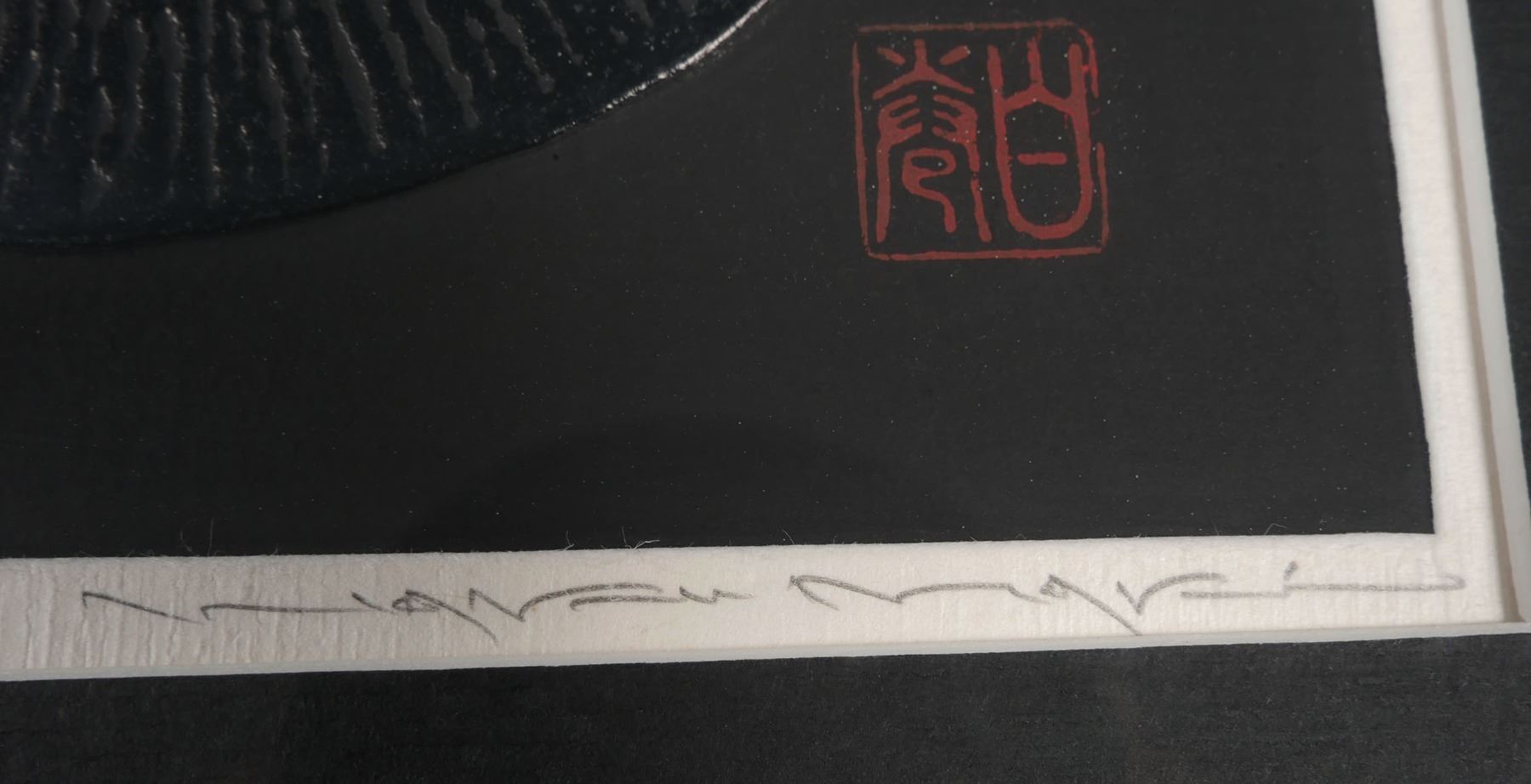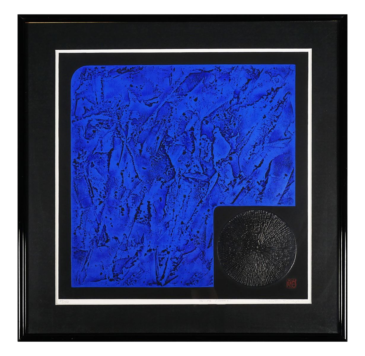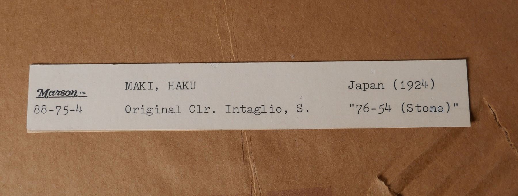 Original color woodblock print with deep relief embossing. Pencil signed, limited (85/106) and titled "76-54 (Stone)" in the lower margin. Image measures approximately 15 1/2" x 15 1/2", framed to 18 1/2" x 18 1/2". Gallery label for Marson, Ltd. affixed verso. Excellent condition.