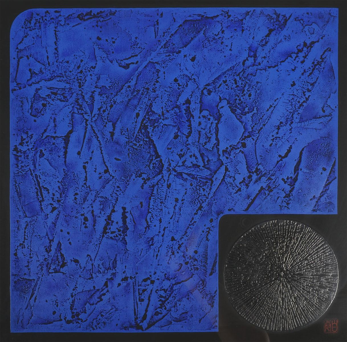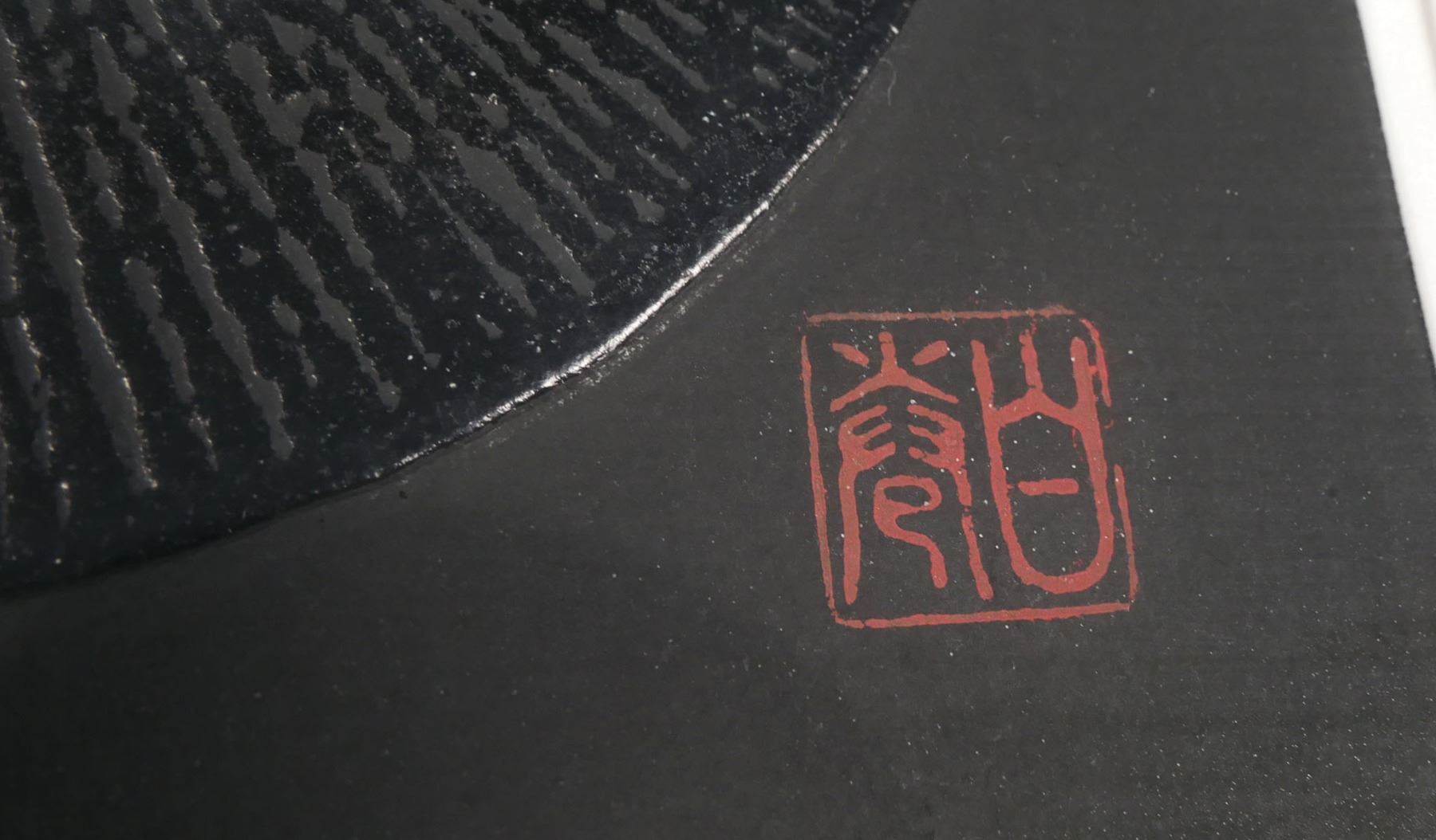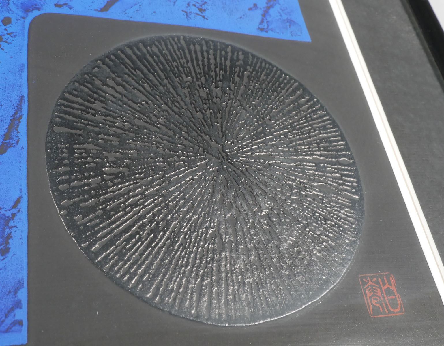 Original color woodblock print with deep relief embossing. Pencil signed, limited (85/106) and titled "76-54 (Stone)" in the lower margin. Image measures approximately 15 1/2" x 15 1/2", framed to 18 1/2" x 18 1/2". Gallery label for Marson, Ltd. affixed verso. Excellent condition.
