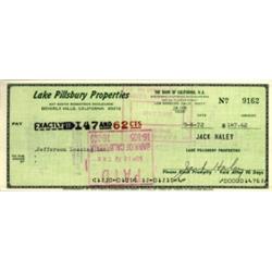 <b>1331. JACK HALEY</b> (1899 - 1979) American comedic actor remembered for his role as The Tin Man in The Wizard of Oz. Partly-printed D.S. 1p. oblong 12mo., Beverly Hills, Sept. 6, 1972, a check drawn on the Lake Pillsbury Properties account, ordering payment of $147.62 to Jefferson Leasing Inc. Signed by Haley at bottom right. Stamp cancels to middle portion not affecting signature, very good condition.<b> $75-100</b>
