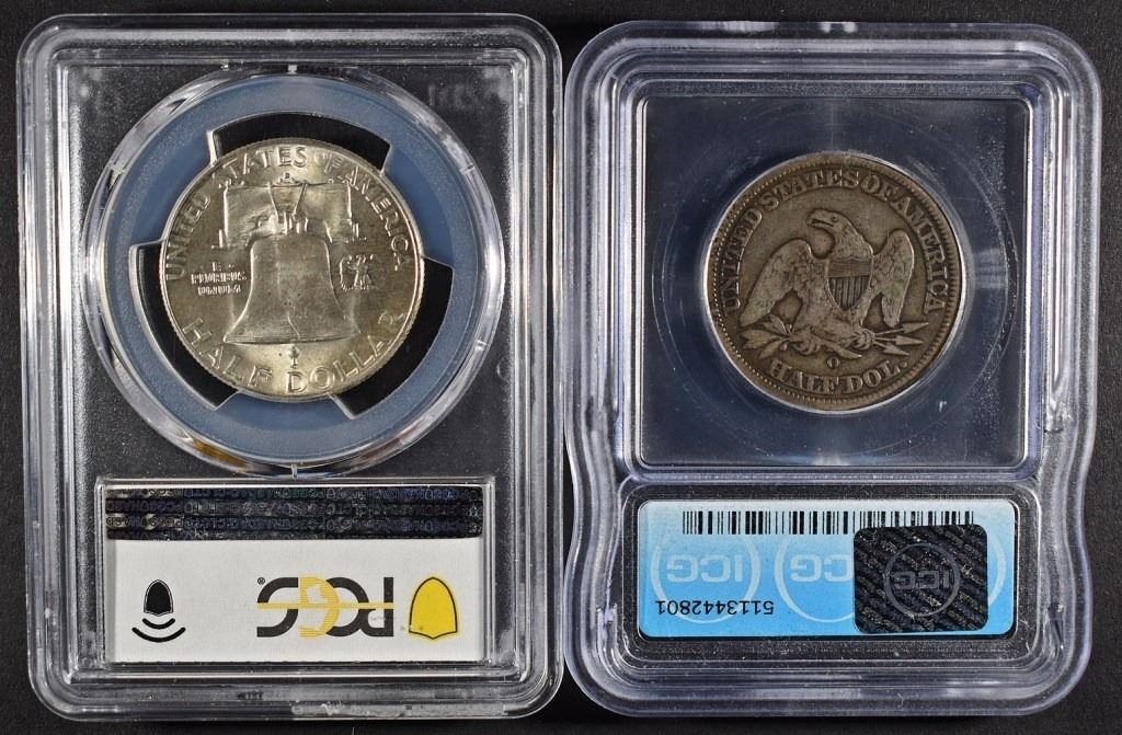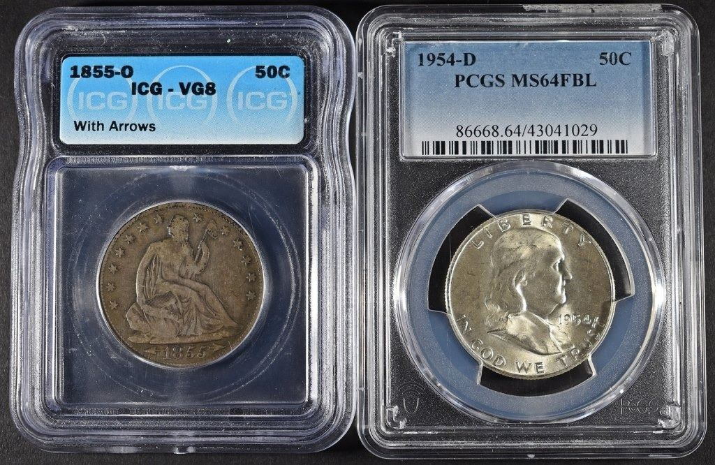 1855-O ARROWS HALF VG8 ICG & 1954-D 50C MS64FBL PCGS ESTIMATE $100 - $120.