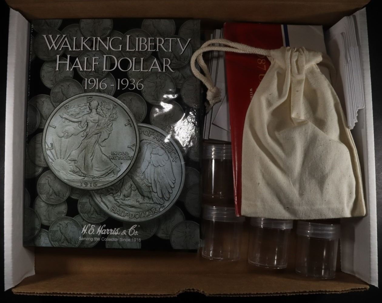 INCLUDES: (2) WALKING LIBERTY HALF DOLLAR ALBUMS, (2) KENNEDY HALF DOLLAR ALBUMS, (13) COINS WORTH $30-$40 (SOME 90% SILVER, SOME 40% SILVER, SOME NON-SILVER), TUBES, FLIPS, 2X2s, 1987 US MINT SET ESTIMATE $120 - $170.