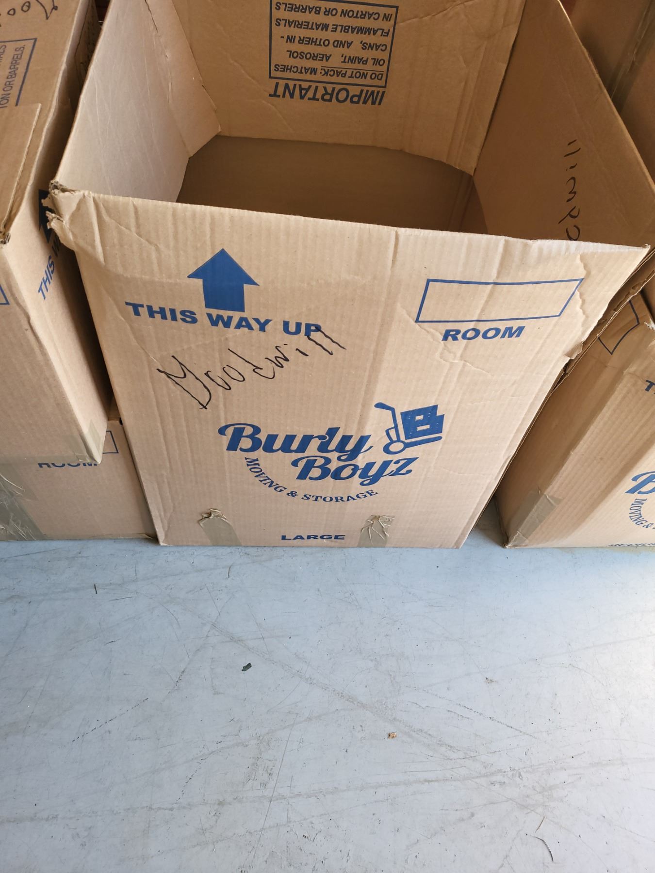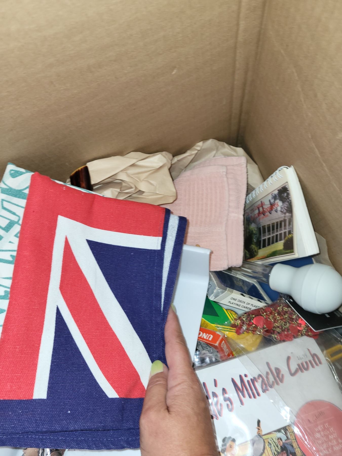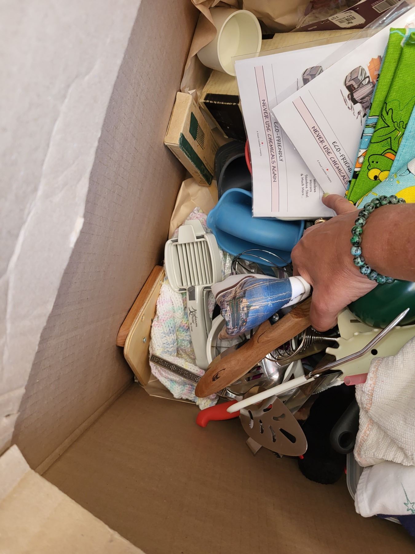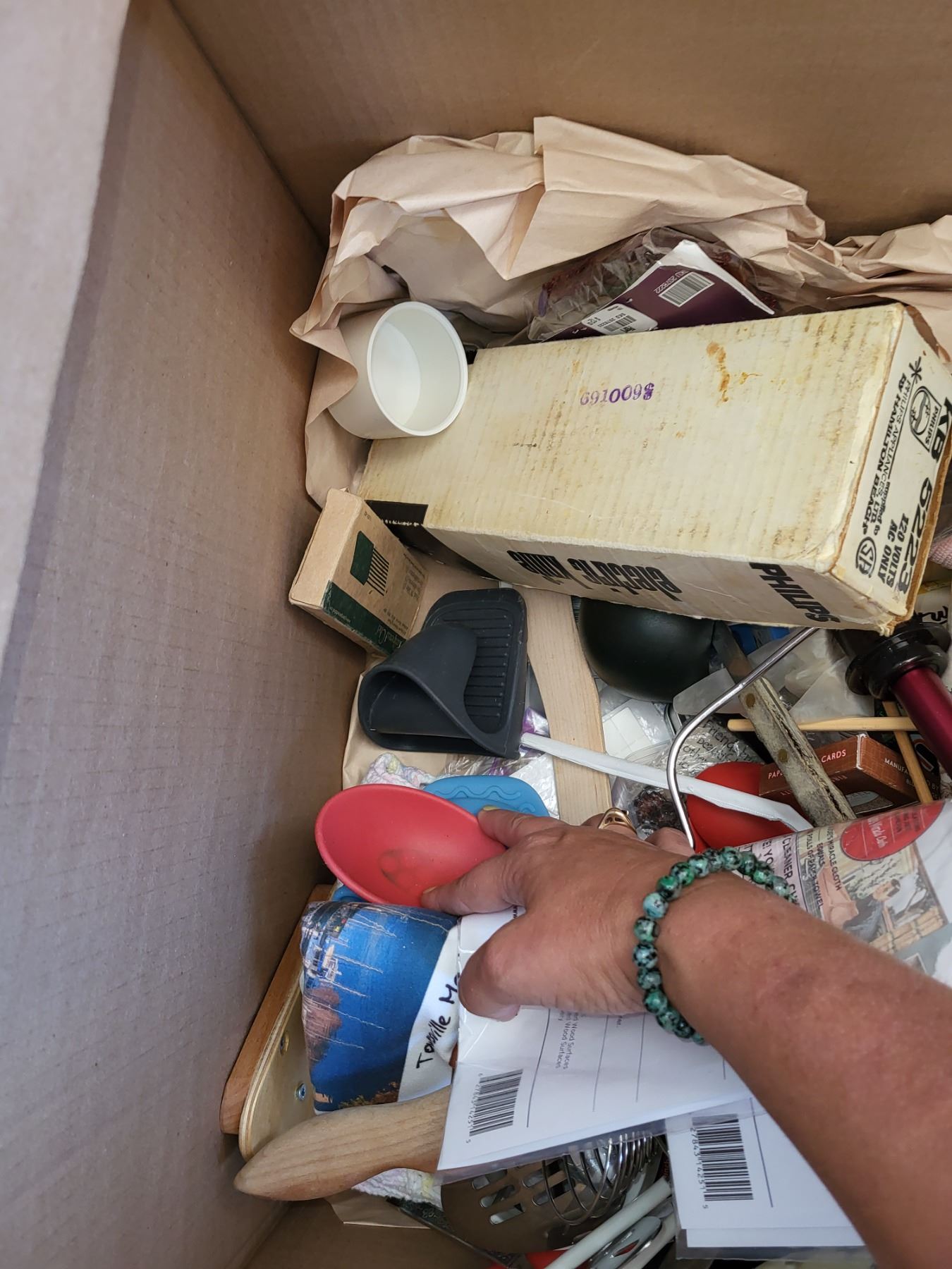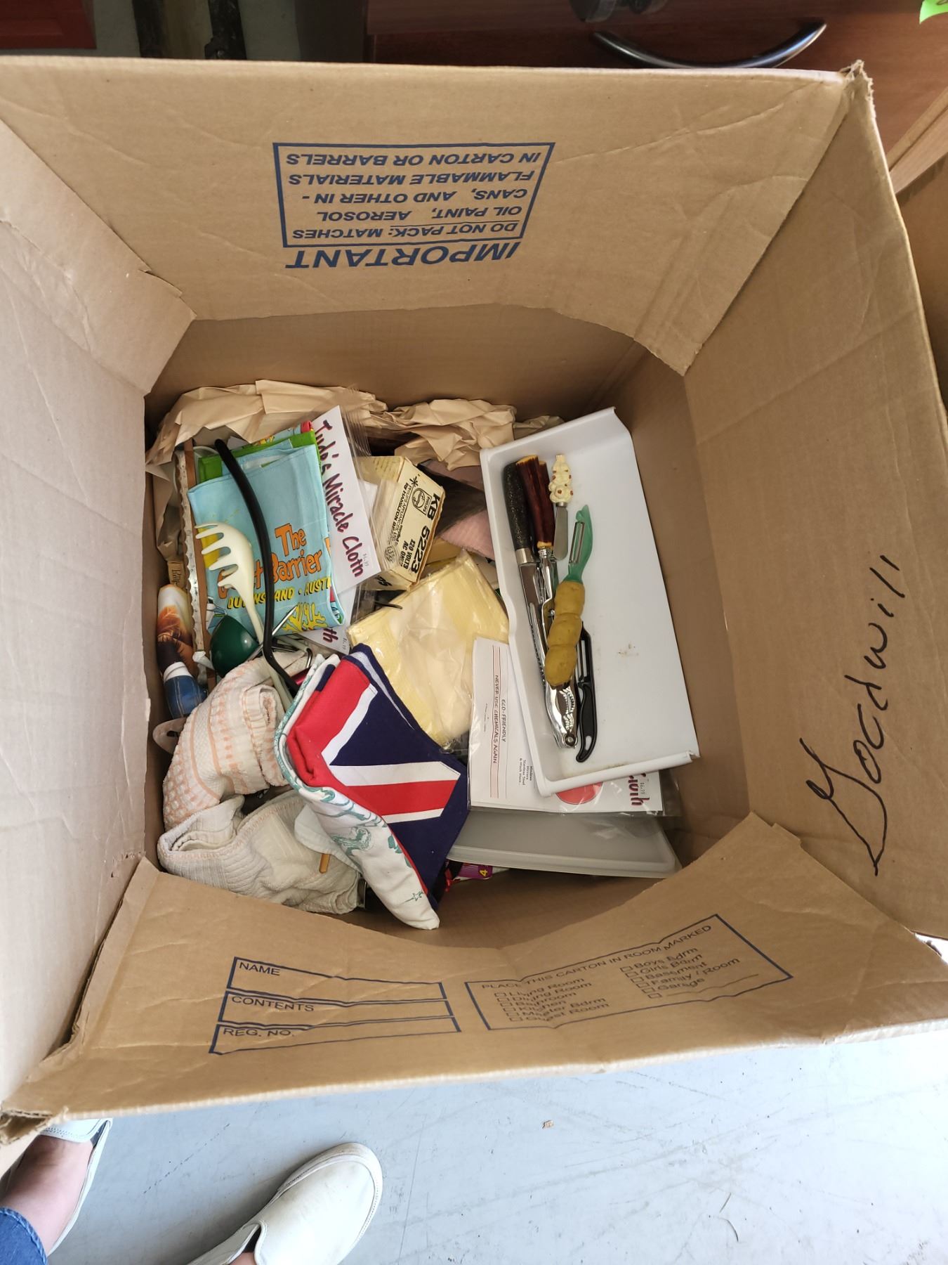 HALF OF LARGE MOVING BOX WITH VARIOUS RANDOM GOODIES