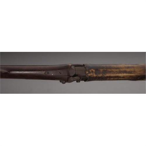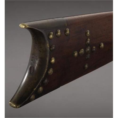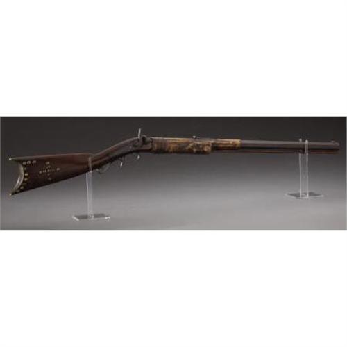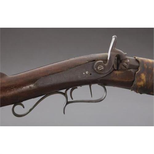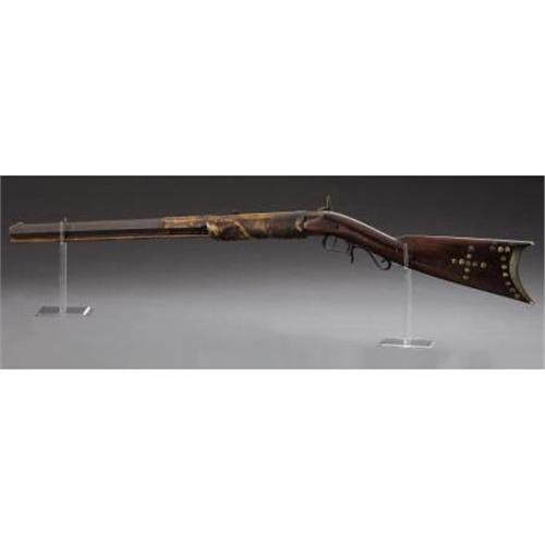 <B>HALF STOCK PERCUSSION PLAINS RIFLE.</B></I> Circa 1850s. 27 ½” octagon barrel in .43 calibre. No visible marking. Back action lock is engraved. Brass butt plate, toe plate and scrolled trigger guard. Double set triggers function. Walnut stock is decorated with tacks at the butt end and a long rawhide wrap on forestock extending onto the barrel for about 4”. Rawhide wrap and tacks have been applied after the rifle experienced the majority of its actual use. Ramrod secured to underside of barrel by one iron ferrel.<BR><BR><B>Condition:</B></I>All metal components have turned naturally to a dark brown to black color. Brass butt plate and trigger guard black with age. Walnut stock normal wear and handling abrasions.<BR><BR><b>Shipping:</b> Bats, Clubs, Sticks, Swords, Rif (<a target="_blank" href="http://www.heritageauctions.com/common/shipping.php">view shipping information</a>)