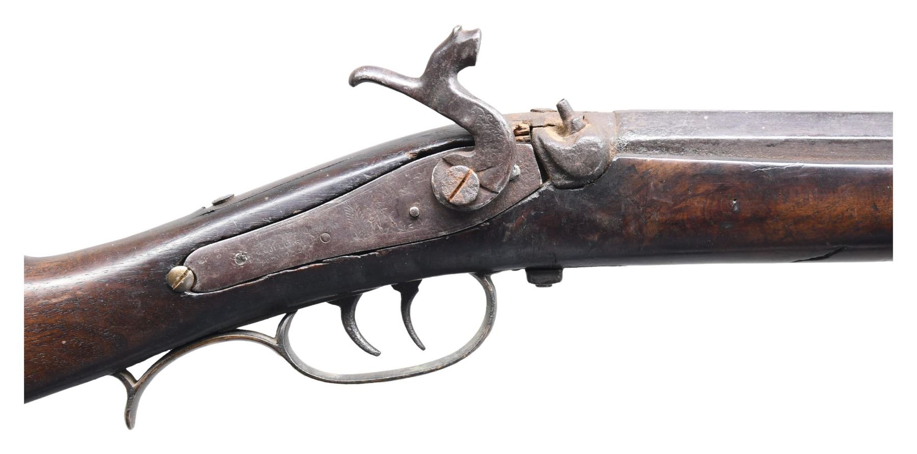 LOCK. Cal. 45. NSN. Oct. 27 3/8" bbl. w/ matching numbered breech. Blade front sight & notch rear sight. Back action lock w/ engraving & "G. GOULCHER". Half length walnut stock w/ crescent buttplate, dbl. set triggers, replacement brass finger curl triggerguard & replacement ramrod on replacement brass pipe. CONDITION: metal has brown patina appearance with pitting. Lock has replacement hammer & hammer screw, lock will not release hammer from full cock (need gunsmith attention). Fair worn wood finish showing deep marks, chips around lock & wood erosion around forend tip. Pitted bore. (01-26260/MD). ANTIQUE. $100-200.