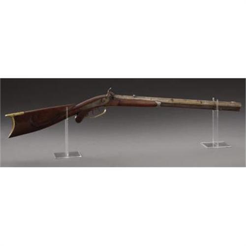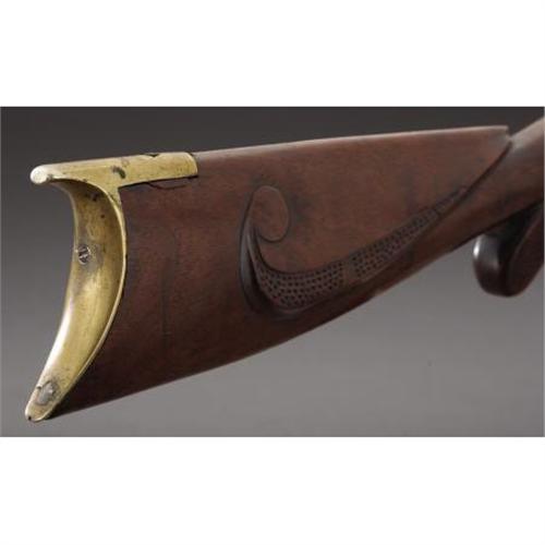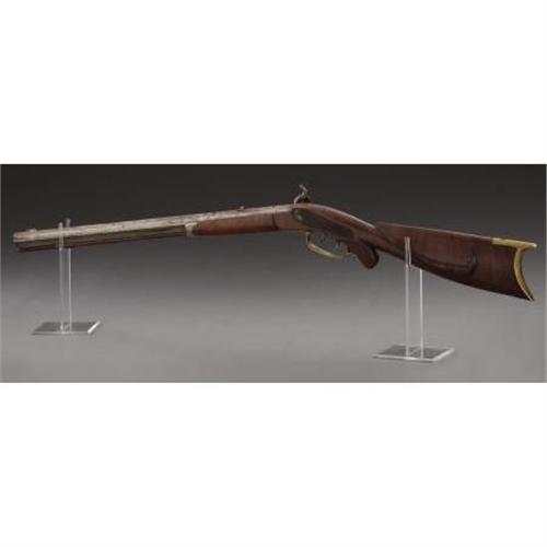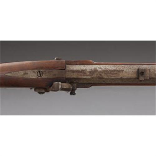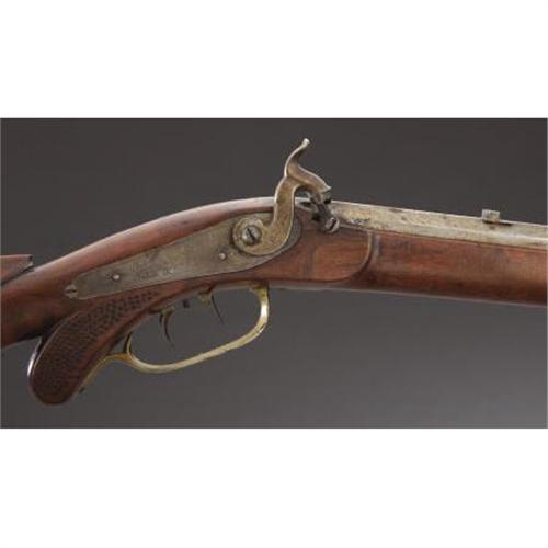 <B>HALF STOCK PERCUSSION PLAINS RIFLE.</B></I> 21 ½” octagon barrel in .36 calibre. Back action lock marking filed down to where only the following is visible: “H.E.” above “WARRANTED”. This homemade rifle is basically a composition of parts from a wide range of time periods. Overall appearance indicates it was constructed somewhere in the mid 1800s. Double set triggers. Crudely engraved trigger guard. Stock has two cheek pieces, is pistol gripped and capped in lead. Brass butt plate.<BR><BR><B>Condition: </B></I>Basically a bright metal rifle with staining and rust on metal parts. Brass has a slight patina. Wood stock is unconventionally shaped.<BR><BR><b>Shipping:</b> Bats, Clubs, Sticks, Swords, Rif (<a target="_blank" href="http://www.heritageauctions.com/common/shipping.php">view shipping information</a>)