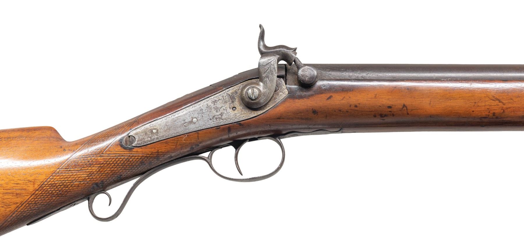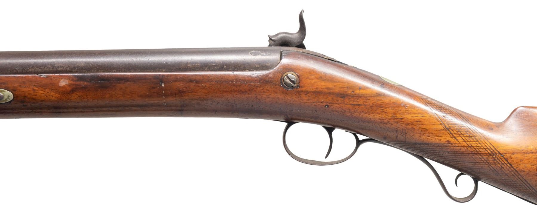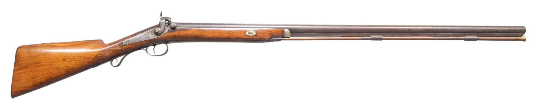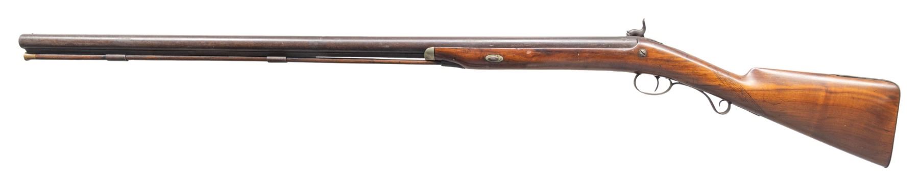 Cal. 70. NSN. Barrel has been sourced from US musket being cut to 35.5" having added under rib. Breech section has bolster conversion; proofs include "US" in oval then "eagle head over P". "ASHEMORE" marked back action lock. Wedge fastened walnut stock w/ hardwood ramrod, pewter nose cap & iron furniture. CONDITION: barrel & most other metal parts have dark brown patina appearance with corrosion. Barrel tang is broken & missing. Sanded & refinished wood shows handling marks & a few large cracks. Dark pitted bore. Mechanically fine. PROVENANCE: Estate Collection of Nicholas Apergis. (01-27468/MD). ANTIQUE. $350-500.
