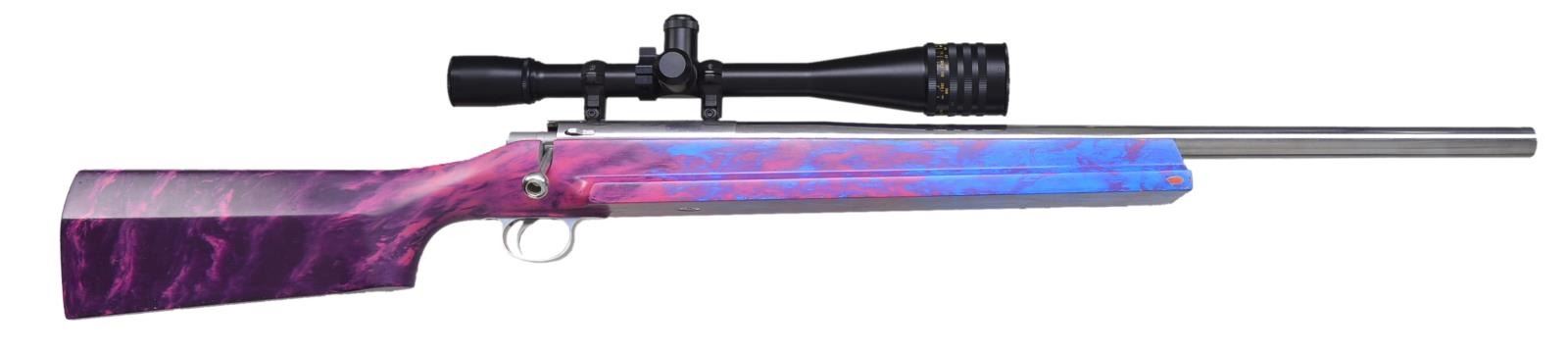 Cal. 22 LR. S# 96. Bbl. 23", polished stainless bull bbl. measuring .938" at muzzle w/ slight taper to 1.50" before change to full shank 1.250" diameter (2 1/2" forward of receiver). Very low numbered single shot action w/ integral grooved rail; considered 1 of the ultimate rimfire benchrest actions having desirable left port opposite right bolt handle. Unmarked match trigger likely by Hall. Exotic looking synthetic stock w/ mixture of blue, lavender & black colors. Flared flat forend 16" long & 3" wide. Flat grip cap & toeline; 1/2" wide. Contoured matching colored butt area. LOP: 13". Very nicely sculpted area around natural finished aluminum trigger guard retained only by rear screw; pillar bedded action screws. Weaver matte finished CT36 Micro-Trac target scope w/ capped target turrets, adj. objective & spirit level on tube. Fine cross wire & dot reticle. High Burris steel rings. Screw in lens caps. CONDITION: occasional sm. scuff marks in finish of stock; all other aspects near excellent including bore. PROVENANCE: From the Frederic W. Thrane Collection. (20-2469/NW). MODERN. $800-1,200.
