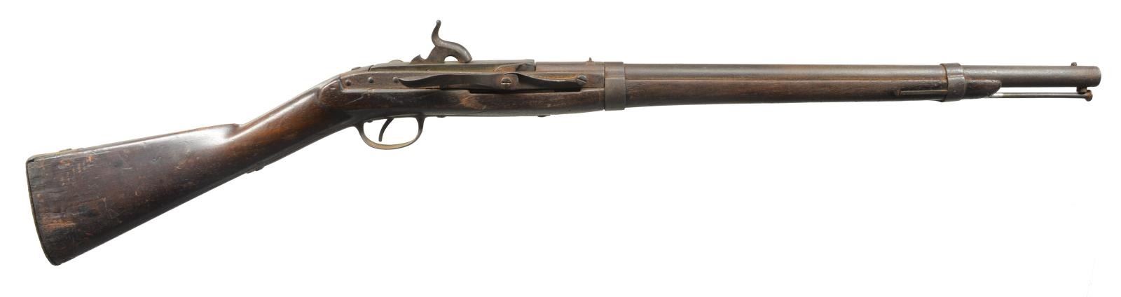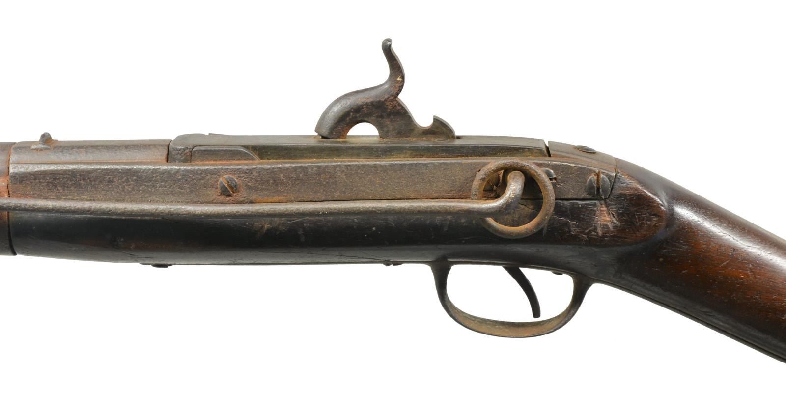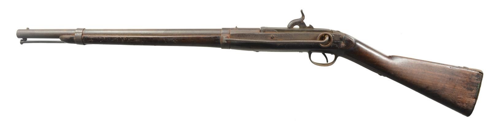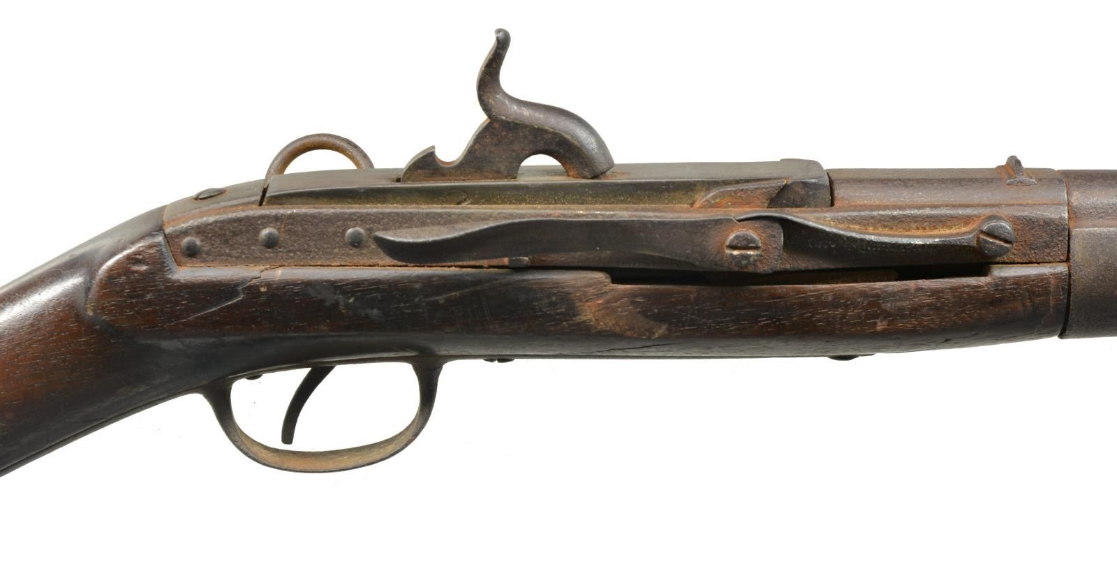 Cal. 52. NSN. Bbl. 21" w/ smooth bore. Blade front sight w/ fixed V notch rear sight. Single shot percussion rifle. Breech block is operated by a thumb lever along right side of action & tips up for loading. Left side has saddle ring & bar. Band fastened walnut stock w/ steel buttplate & button tipped iron ramrod. Total quantity of approx. 10,500 mfg. 1844-1853. CONDITION: metal has faded to brown showing general pitting. Wood has dark worn appearance having erosion in the butt area w/ cracks around action & buttplate. Dark pitted bore. (01-18297/DS). ANTIQUE. $700-1,100.