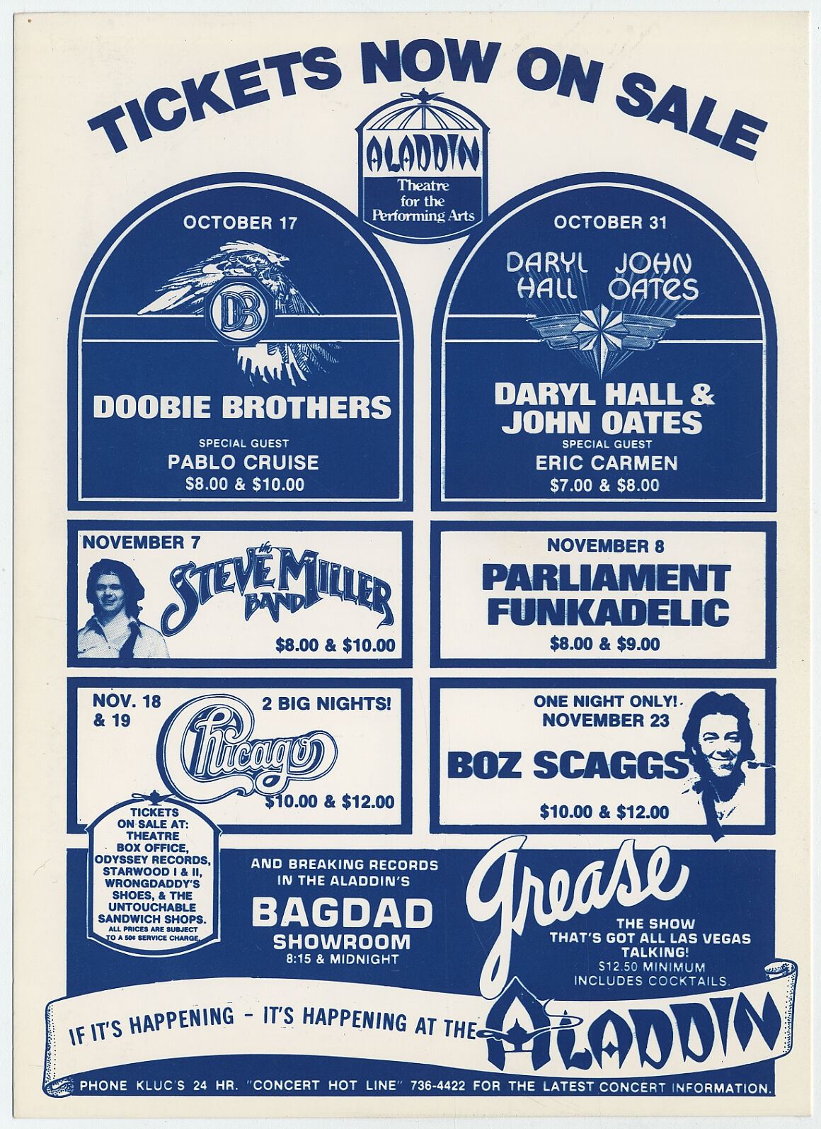 HALL & OATES / Doobie Bros./ Parliament Funkadelic /Steve Miller 1977 Vegas Concert Handbill