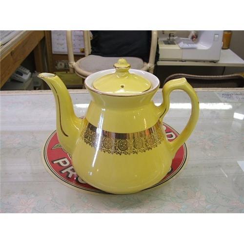 This hard to find 10 cup teapot is Hall's Philadelphia in yellow glaze with standard gold decoration. It was first made in 1923. This teapot is in excellent condition and the only wear on any of the gold is a small bit at the spout otherwise I would have to call the whole teapot in mint condition including the gold. It is fully marked on the bottom. It is about 7" tall to the top of the lid finial and about 9" wide including spout and handle.