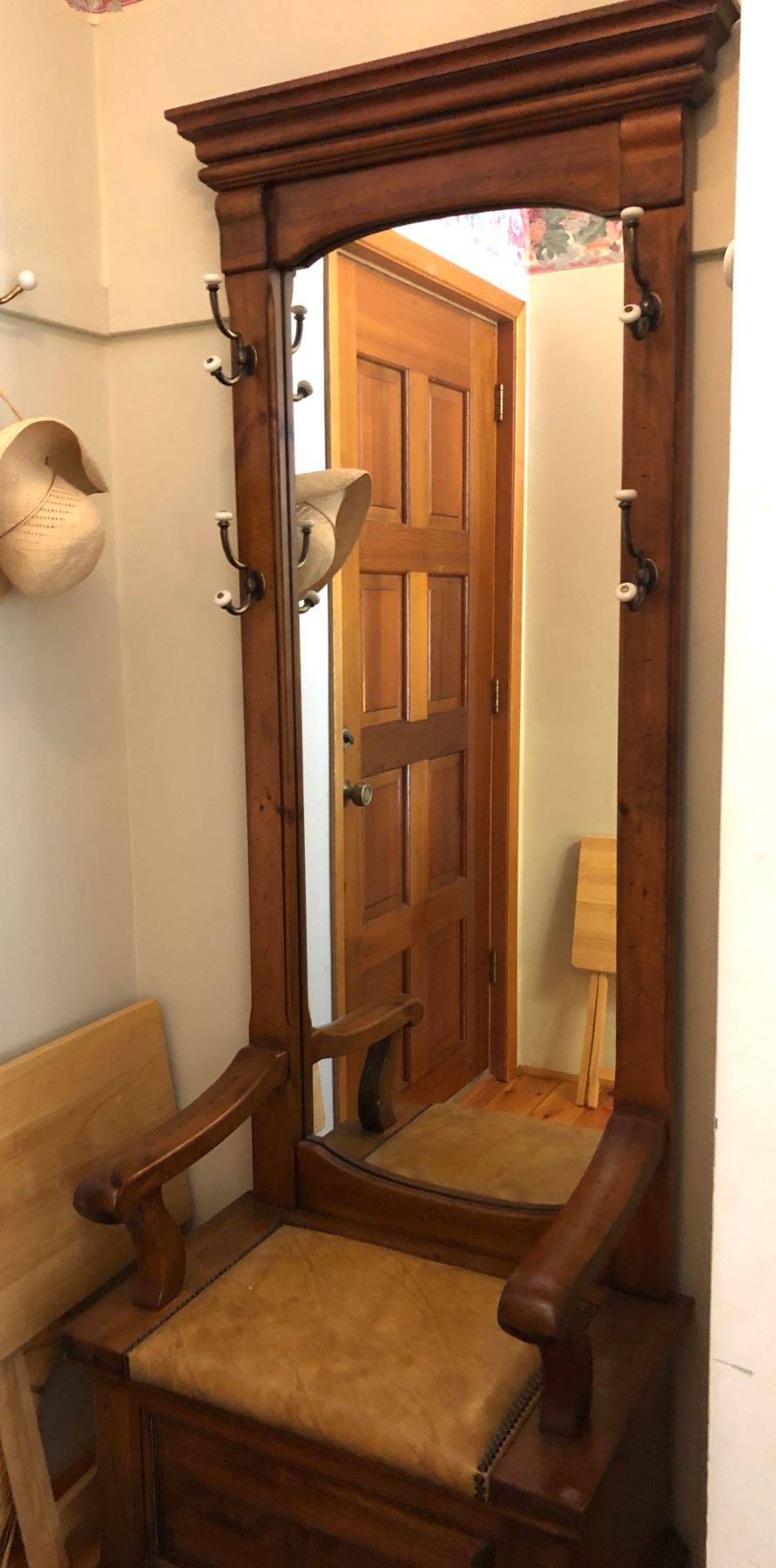 NICELY FINISHED WOOD HALL TREE WITH IN SEAT STORAGE.