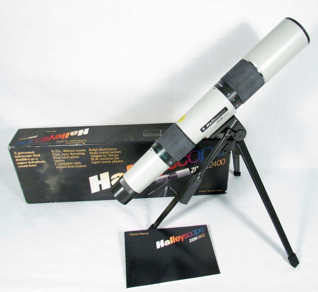 HALLEYSCOPE ZOOM 2400 TELESCOPE IN ORIGINAL BOX - Personal telescope that doubles as a super-telephoto zoom lens. 8-32x, 40mm zoom. Adapts to 35mm SLR cameras for super xoom photos.