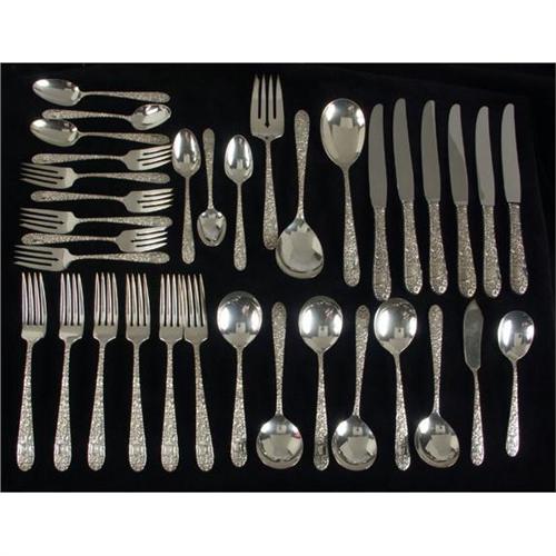 STERLING SILVER: A lot of 35 pieces of sterling silver flatware, hallmarked ''Hallmark Silversmiths'', ''Ribbon Rose'', Monogrammed '' R'' , consisting of 6 dinner knives with stainless blades 9.50'', 6 dinner forks 7.75'', 6 teaspoons 6'', 6 round cream spoons 7'',6 salad forks 6.25'', 2 serving spoons 8.50'', 1 Meat Fork 8.25'', 1 sugar spoon 6'', 1 flat butter knife 7.'', pattern was discontinued in 1942, 28.5 ozt excluding knives . Note: Set shows little wear, some minor pitting on the butter knife, silver chest included.