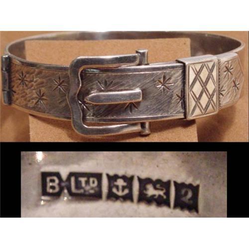 This is a 32 gram solid sterling bracelet that has a hinged front with a slide in buckle. THe clasp actually is a hinge that moves outward so the front can slide thru the loop. This is almost 1" wide and measures 6 1/2" long on the inside around the wrist. This has the hallmarks B LTD Anchor lion and hte number 2. This is really well made and thick with nice workmanship. Looks like it has never been worn.